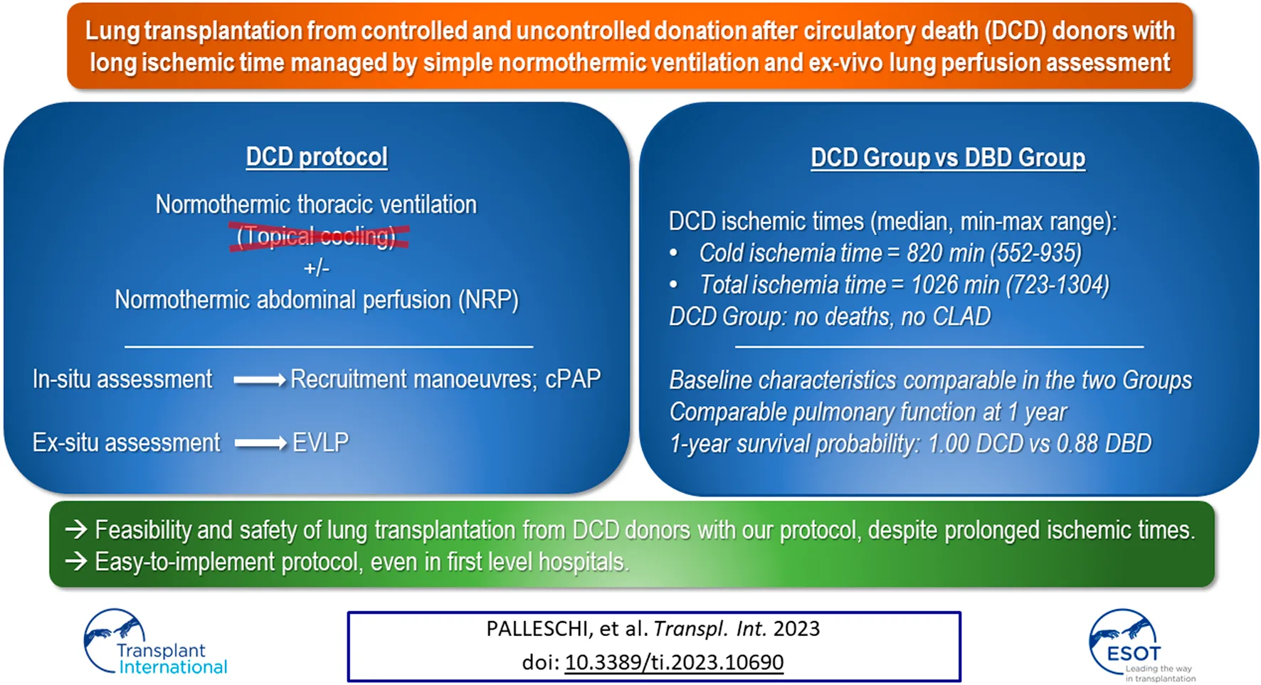 Palleschi A, Zanella A, Citerio G, Musso V, Rosso L, Tosi D, Fumagalli J, Bonitta G, Benazzi E, Lopez G, Rossetti V, Morlacchi LC, Uslenghi C, Cardillo M, Blasi F, Grasselli G, Valenza F and Nosotti M (2023) Lung Transplantation From Controlled and Uncontrolled Donation After Circulatory Death (DCD) Donors With Long Ischemic Times Managed by Simple Normothermic Ventilation and Ex-Vivo Lung Perfusion Assessment. Transpl Int 36:10690. doi: 10.3389/ti.2023.10690
