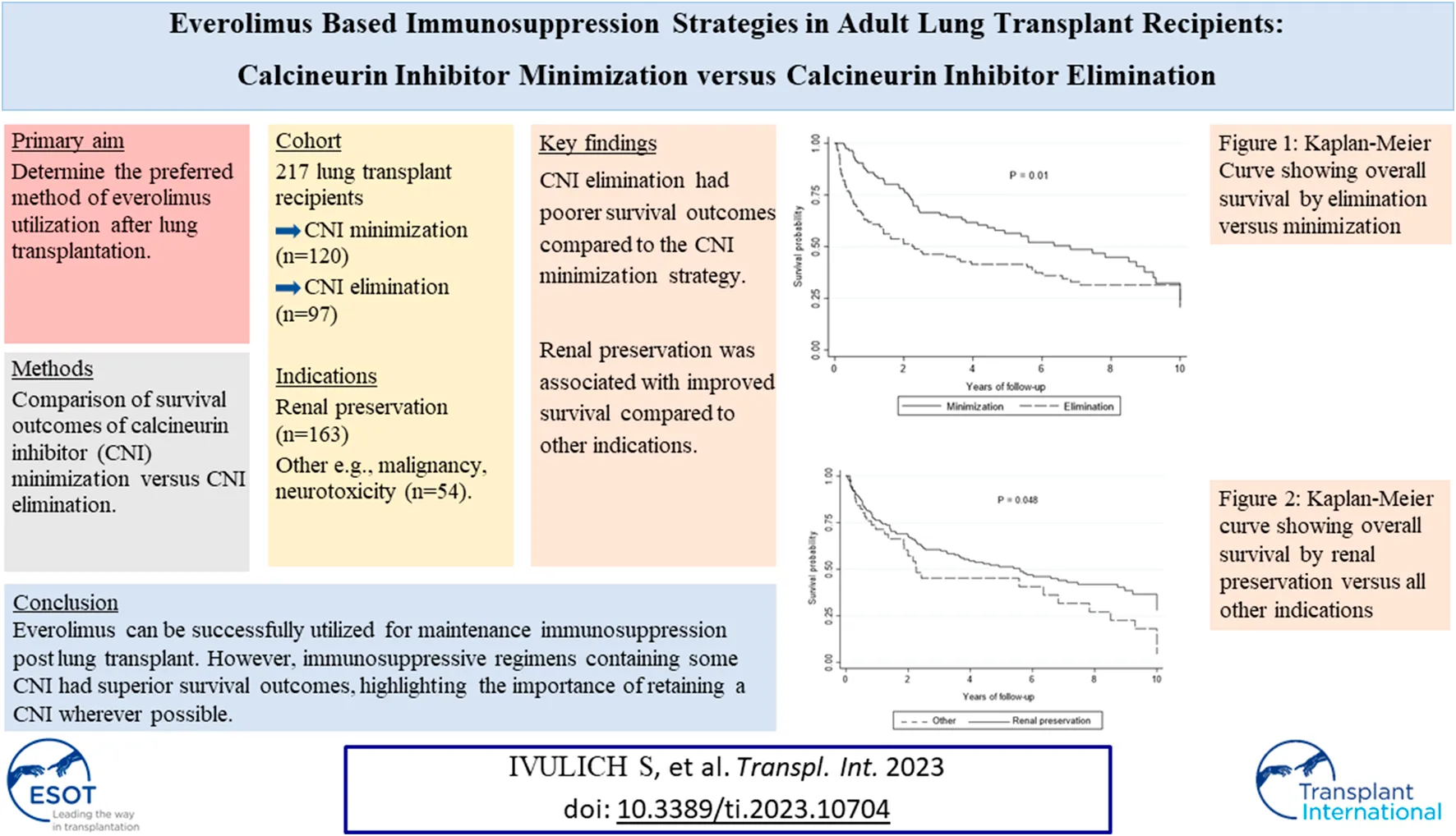 Ivulich S, Paul E, Kirkpatrick C, Dooley M and Snell G (2023) Everolimus Based Immunosuppression Strategies in Adult Lung Transplant Recipients: Calcineurin Inhibitor Minimization Versus Calcineurin Inhibitor Elimination. Transpl Int 36:10704. doi: 10.3389/ti.2023.10704