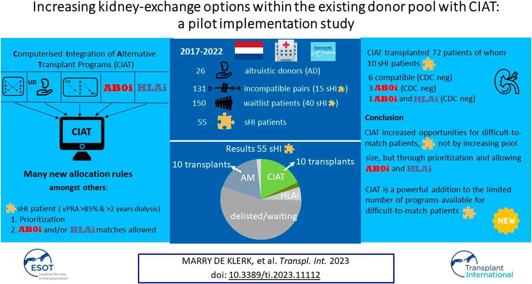 de Klerk M, Kal-van Gestel JA., Roelen D, Betjes MG.H., de Weerd AE., Reinders ME.J., van de Wetering J, Kho MM.L., Glorie K and Roodnat JI. (2023) Increasing Kidney-Exchange Options Within the Existing Living Donor Pool With CIAT: A Pilot Implementation Study. Transpl Int 36:11112. doi: 10.3389/ti.2023.11112