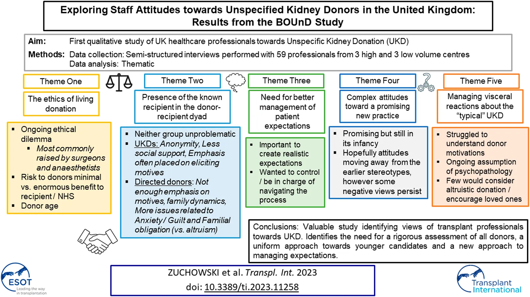 Zuchowski M, Mamode N, Draper H, Gogalniceanu P, Norton S, Chilcot J, Auburn T, Clarke A, Williams L, Burnapp L, McCrone P and Maple H (2023) Exploring Staff Attitudes Towards Unspecified Kidney Donors in the United Kingdom: Results From the BOUnD Study. Transpl Int 36:11258. doi: 10.3389/ti.2023.11258