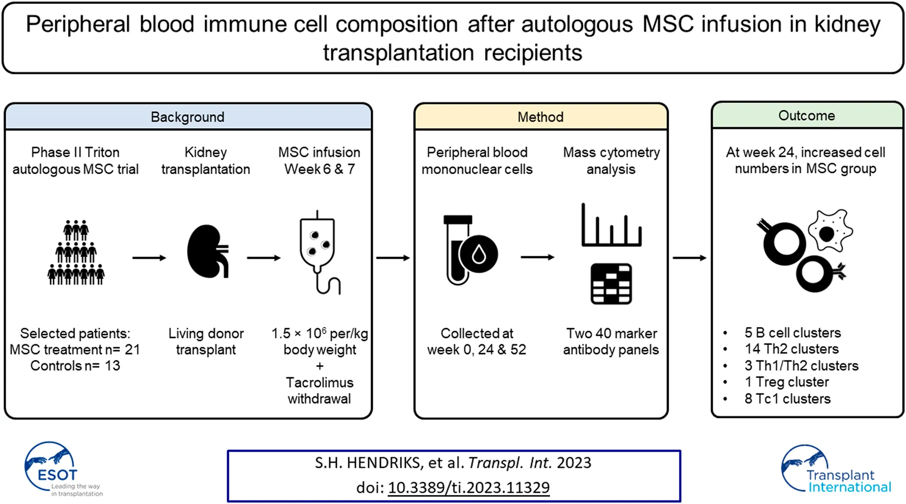 Hendriks SH., Heidt S, Schulz AR., de Fijter JW., Reinders ME.J., Koning F and van Kooten C (2023) Peripheral Blood Immune Cell Composition After Autologous MSC Infusion in Kidney Transplantation Recipients. Transpl Int 36:11329. doi: 10.3389/ti.2023.11329