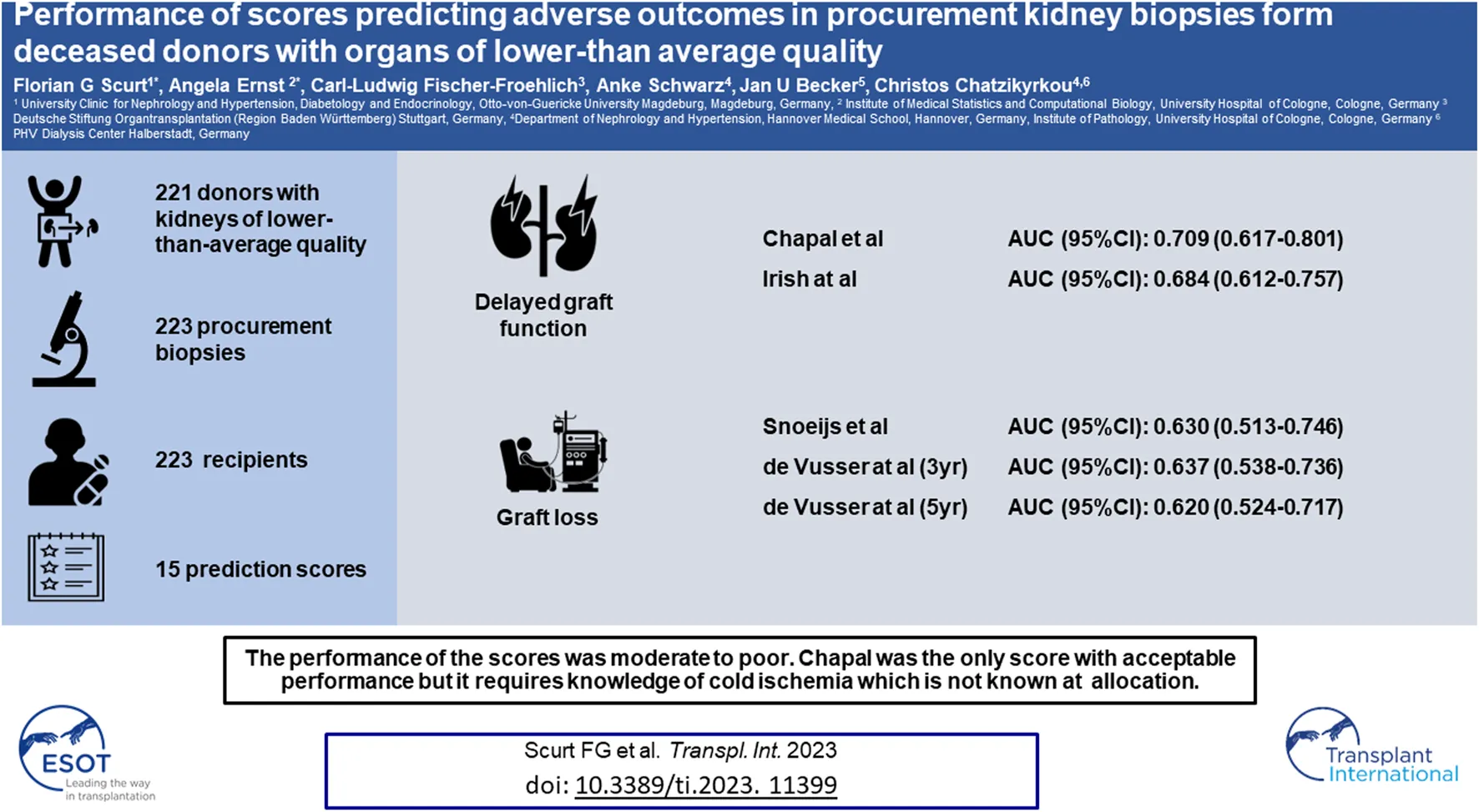 Scurt FG., Ernst A, FischerFröhlich C-L, Schwarz A, Becker JU. and Chatzikyrkou C (2023) Performance of Scores Predicting Adverse Outcomes in Procurement Kidney Biopsies From Deceased Donors With Organs of Lower-Than-Average Quality. Transpl Int 36:11399. doi: 10.3389/ti.2023.11399