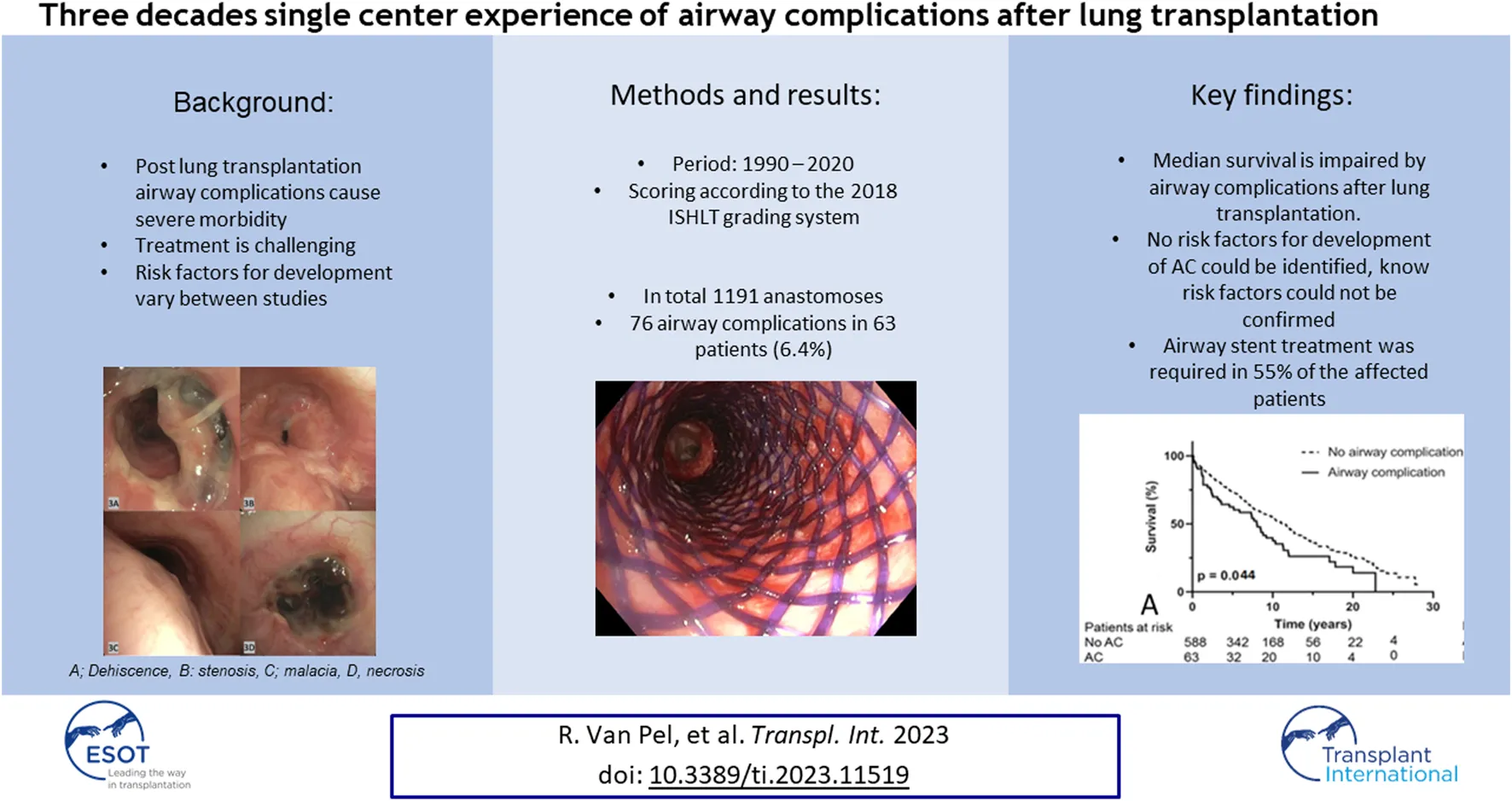 van Pel R., Gan C.T., van der Bij W., Verschuuren E.A.M., van Gemert J.P.A., Van De Wauwer C., Erasmus M.E. and Slebos D.J. (2023) Three Decades Single Center Experience of Airway Complications After Lung Transplantation. Transpl Int 36:11519. doi: 10.3389/ti.2023.11519
