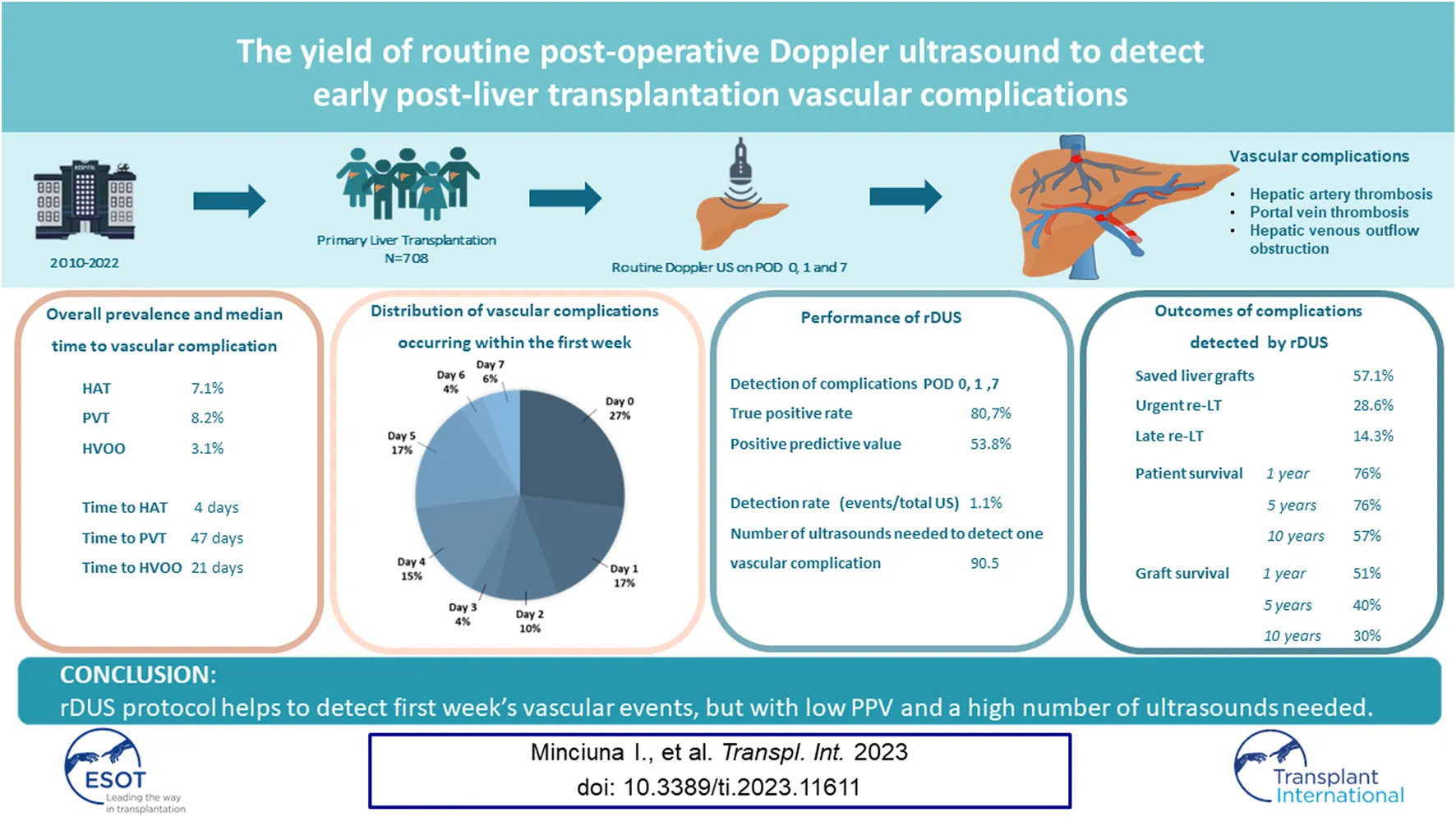 In conclusion, the majority of post-LT vascular complications occur during the first week. rDUS detects the majority of events during protocol days, but with low PPV and a high number of ultrasounds needed. However, a true clinical benefit in terms of graft and patient’s survival has yet to be shown.