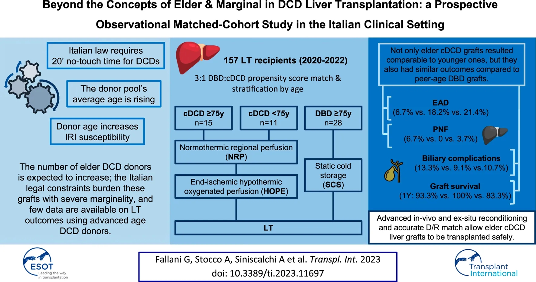 Fallani G, Stocco A, Siniscalchi A, Antonini MV, Stella AP, Amato A, Prosperi E, Turco L, Morelli MC, Cescon M and Ravaioli M (2023) Beyond the Concepts of Elder and Marginal in DCD Liver Transplantation: A Prospective Observational Matched-Cohort Study in the Italian Clinical Setting. Transpl Int 36:11697. doi: 10.3389/ti.2023.11697