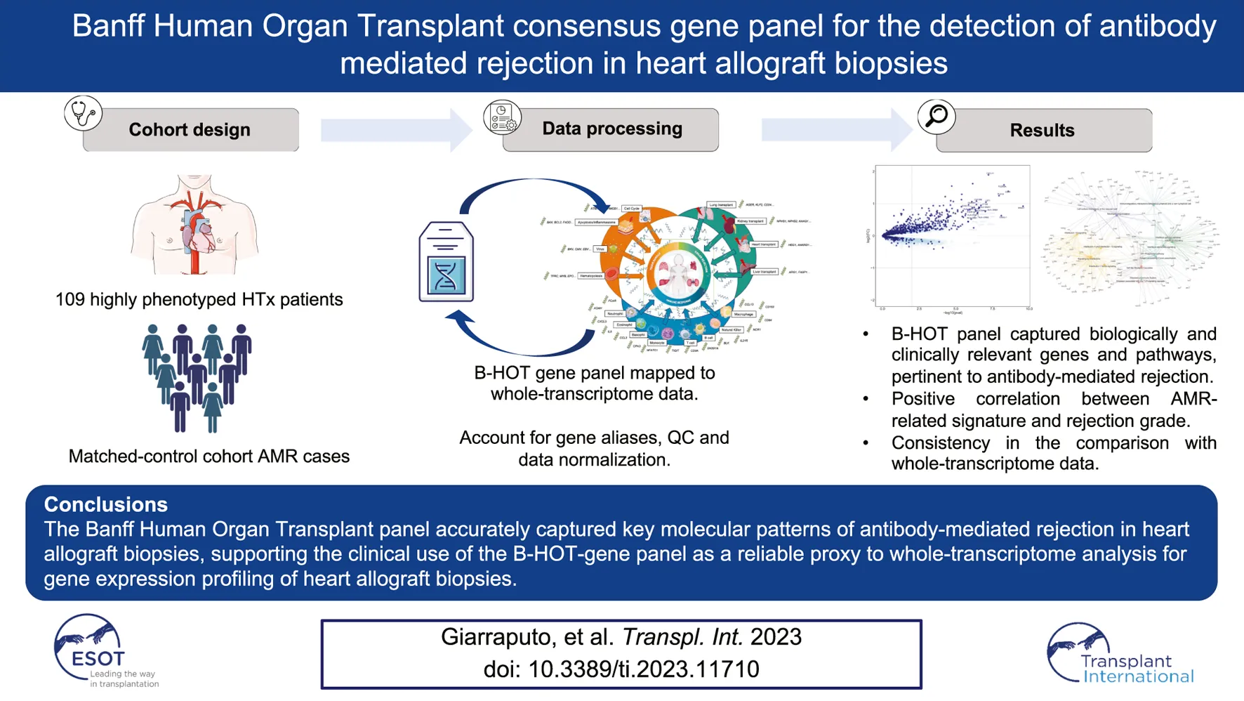 Allograft rejection remains an important complication after heart transplantation associated with poor outcomes. While the incidence and clinical importance of acute cellular rejection has declined over time, antibody-mediated rejection (AMR) is now recognized as a major risk factor for patient death, graft loss and various allograft injuries [1]. Even if important advances have been made in the standardization of its pathology diagnosis, disease severity, degree of myocardial injury and progression stage are crucial pieces of information which are poorly captured by the current working formulation [1]. Whole-transcriptome (WT) gene expression analysis of myocardial tissue has been shown to be a relevant companion tool to refine the pathology diagnosis of AMR after heart transplantation [2, 3]. However, important drawbacks have limited its widespread clinical application (extra-core sampling and inherent procedural risks, low reproducibility, technical and analytical burden) [4]. Targeted molecular profiling applicable to formalin-fixed paraffin-embedded (FFPE) endomyocardial biopsies (EMB) may allow the implementation of molecular diagnosis into the clinical routine [5]. Recently, the Banff Human Organ Transplant Panel (B-HOT), a consensual targeted panel comprising 770 genes, has been designed to capture molecular expression related to tissue injury, innate and adaptive immunity and rejection in solid organ transplants in order to facilitate cost-effective and reproducible expression analysis of solid organ allografts [5]. The combination of a FFPE-based tissue assessment together with pathological phenotyping of heart allograft biopsies had the potential of enlightening novel pathological mechanisms involved in antibody-mediated rejection correlating with pathological assessment. Whether this targeted panel provides enough granularity to capture the complexity and heterogeneity of AMR compared to whole-transcriptome analysis still remains unknown. We aimed to analyze in silico the ability of the B-HOT panel to capture relevant genes, pathways and networks associated with AMR compared to the whole-transcriptome analysis.