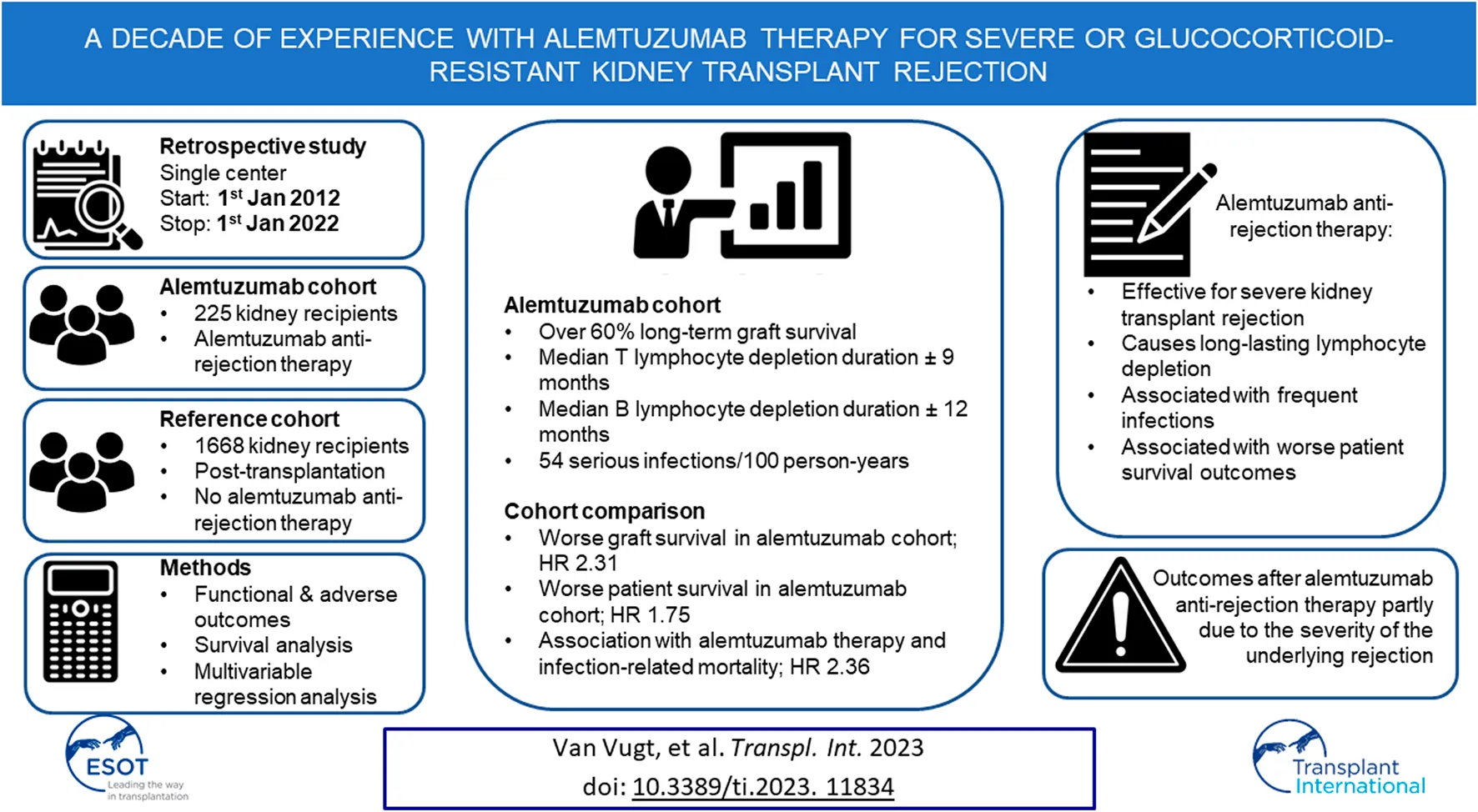 van Vugt LK., van der Zwan M, Clahsen-van Groningen MC., van Agteren M, Hullegie-Peelen DM., De Winter BC.M., Reinders ME.J., Miranda Afonso P and Hesselink DA. (2023) A Decade of Experience With Alemtuzumab Therapy for Severe or Glucocorticoid-Resistant Kidney Transplant Rejection. Transpl Int 36:11834. doi: 10.3389/ti.2023.11834