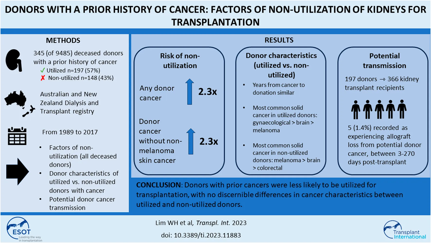 Lim WH, Au E, Teixeira-Pinto A, Ooi E, Opdam H, Chapman J, Johnson DW, Kanellis J, Davies CE and Wong G (2023) Donors With a Prior History of Cancer: Factors of Non-Utilization of Kidneys for Transplantation. Transpl Int 36:11883. doi: 10.3389/ti.2023.11883