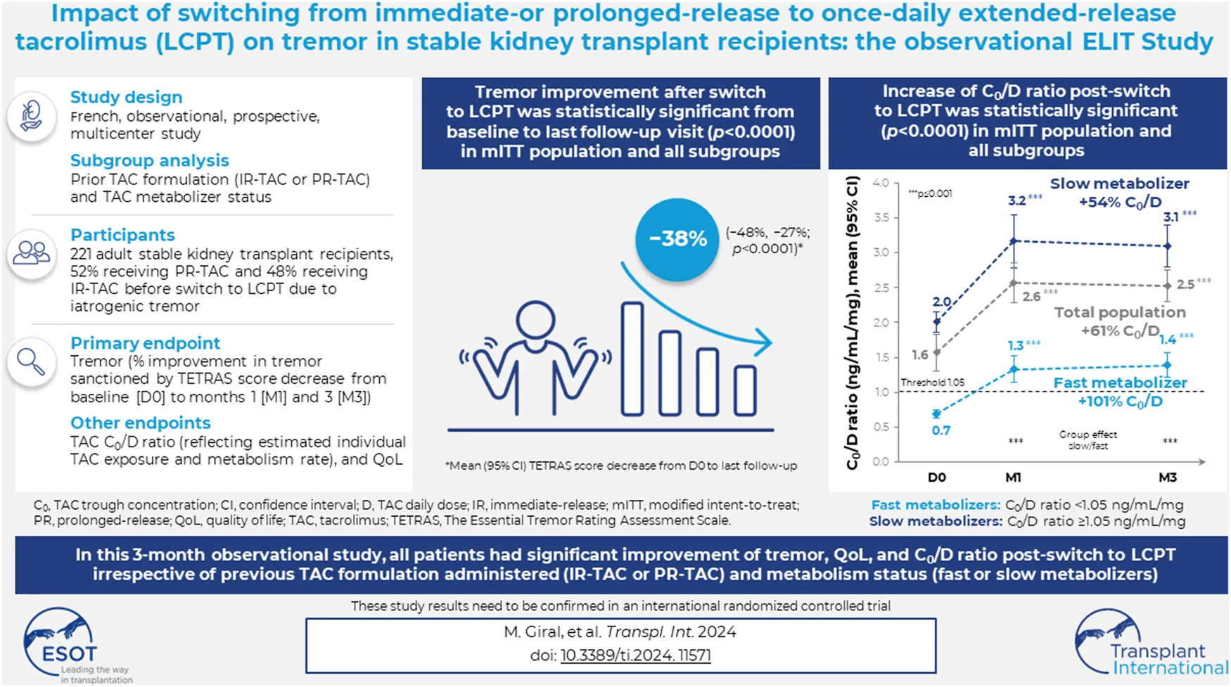 Giral M, Grimbert P, Morin B, Bouvier N, Buchler M, Dantal J, Garrigue V, Bertrand D, Kamar N, Malvezzi P, Moreau K, Athea Y and Le Meur Y (2024) Impact of Switching From Immediate- or Prolonged-Release to Once-Daily Extended-Release Tacrolimus (LCPT) on Tremor in Stable Kidney Transplant Recipients: The Observational ELIT Study. Transpl Int 37:11571. doi: 10.3389/ti.2024.11571