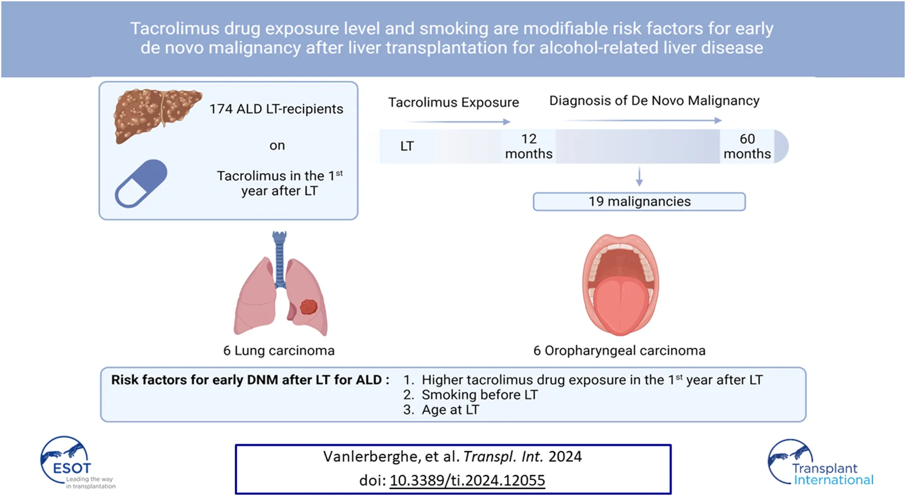 Vanlerberghe BTK, van Malenstein H, Sainz-Barriga M, Jochmans I, Cassiman D, Monbaliu D, van der Merwe S, Pirenne J, Nevens F and Verbeek J (2024) Tacrolimus Drug Exposure Level and Smoking Are Modifiable Risk Factors for Early De Novo Malignancy After Liver Transplantation for Alcohol-Related Liver Disease. Transpl Int 37:12055. doi: 10.3389/ti.2024.12055