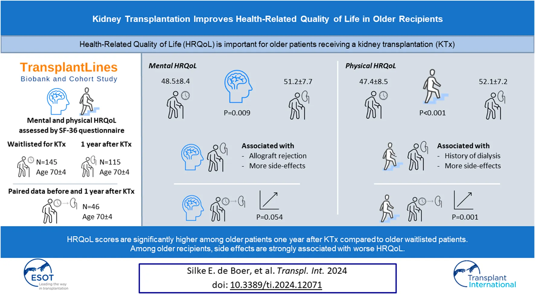 de Boer SE., Knobbe TJ., Kremer D, van Munster BC., Nieuwenhuijs-Moeke GJ., Pol RA., Bakker SJ.L., Berger SP. and Sanders JSF. (2024) Kidney Transplantation Improves Health-Related Quality of Life in Older Recipients. Transpl Int 37:12071. doi: 10.3389/ti.2024.12071