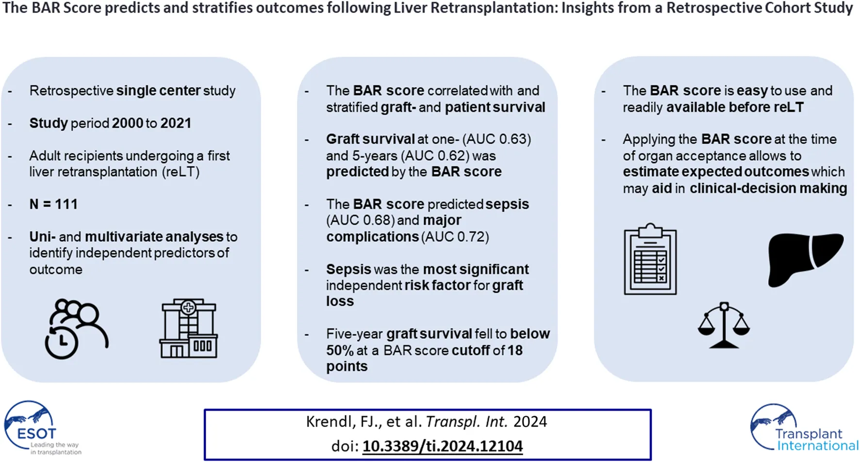 Krendl FJ, Fodor M, Buch ML, Singh J, Esser H, Cardini B, Resch T, Maglione M, Margreiter C, Schlosser L, Hell T, Schaefer B, Zoller H, Tilg H, Schneeberger S and Oberhuber R (2024) The BAR Score Predicts and Stratifies Outcomes Following Liver Retransplantation: Insights From a Retrospective Cohort Study. Transpl Int 37:12104. doi: 10.3389/ti.2024.12104