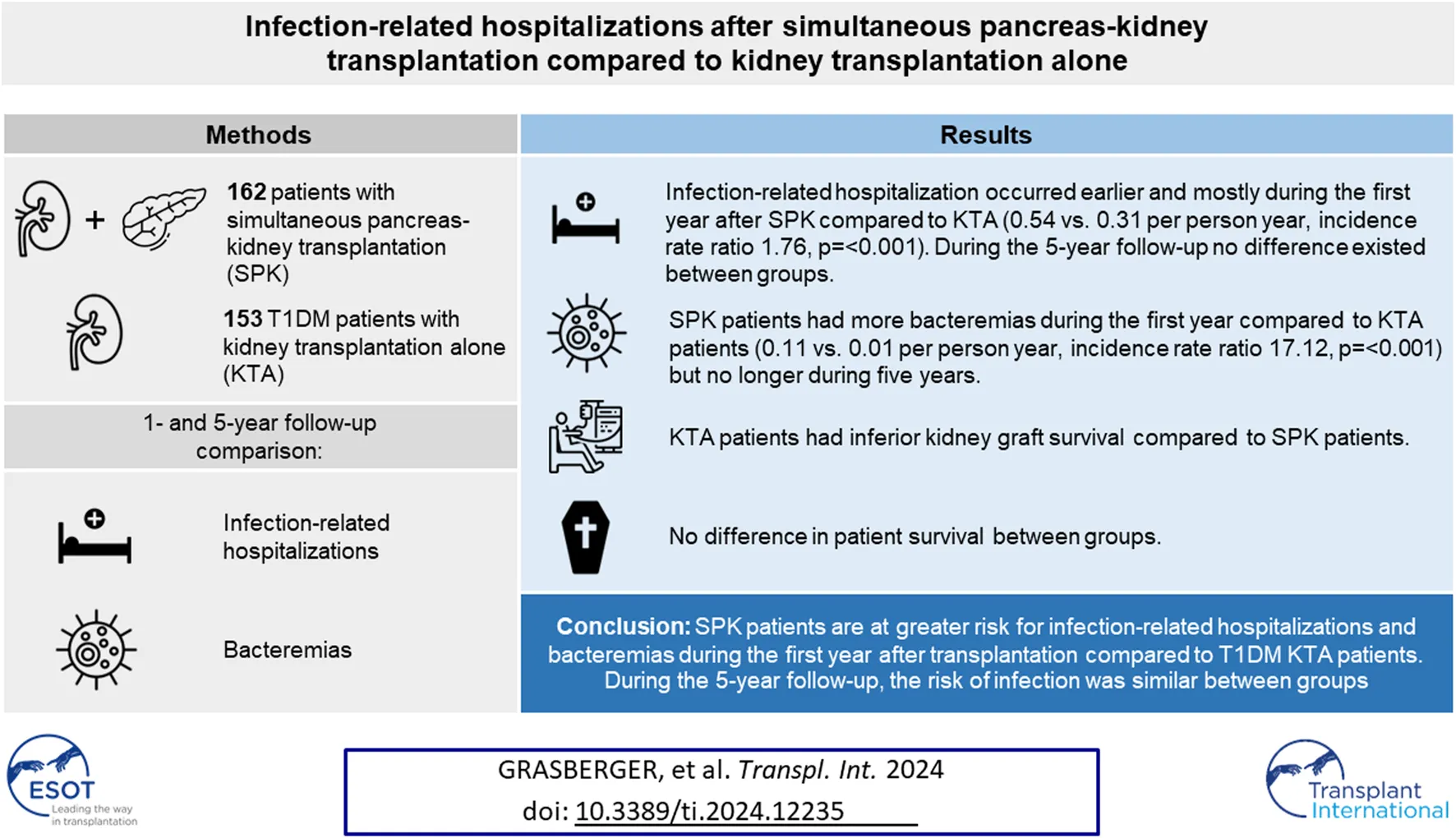 Grasberger J, Ortiz F, Ekstrand A, Sallinen V, Ahopelto K, Finne P, Gissler M, Lempinen M and Helanterä I (2024) Infection-Related Hospitalizations After Simultaneous Pancreas-Kidney Transplantation Compared to Kidney Transplantation Alone. Transpl Int 37:12235. doi: 10.3389/ti.2024.12235