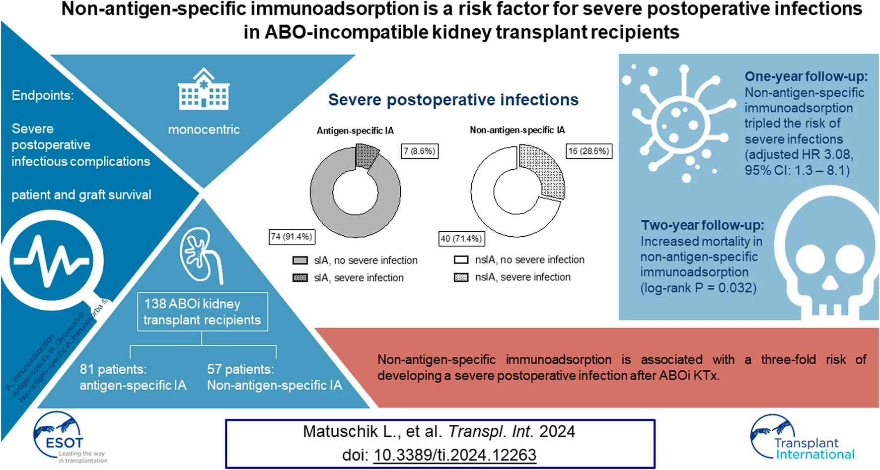 Matuschik L, Seifert G, Lammich K, Holzner P, Tanriver Y, Fichtner-Feigl S, Walz G, Schneider J and Jänigen B (2024) Non-antigen-specific Immunoadsorption Is a Risk Factor for Severe Postoperative Infections in ABO-Incompatible Kidney Transplant Recipients. Transpl Int 37:12263. doi: 10.3389/ti.2024.12263