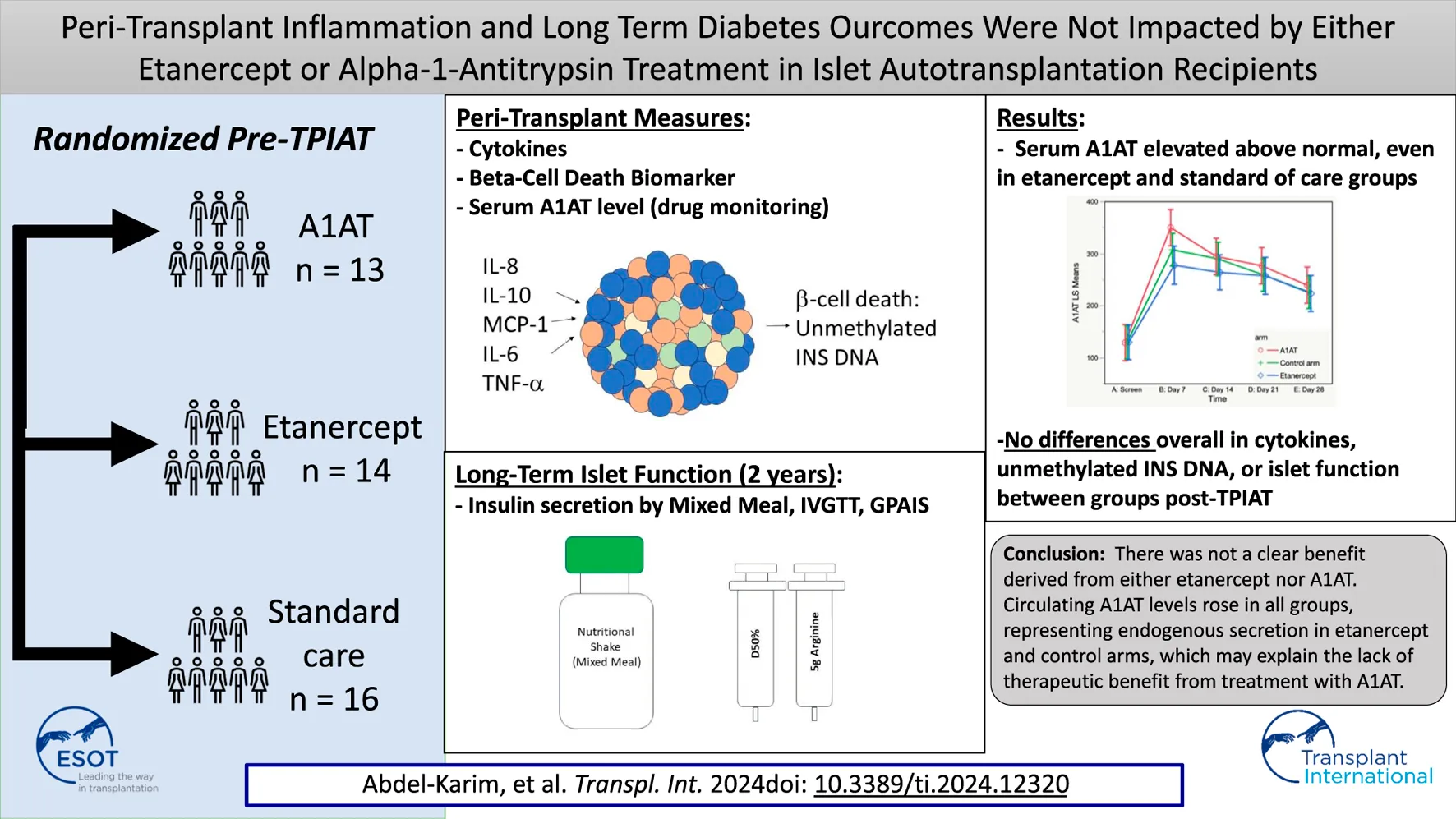 Abdel-Karim TR, Hodges JS, Herold KC, Pruett TL, Ramanathan KV, Hering BJ, Dunn TB, Kirchner VA, Beilman GJ and Bellin MD (2024) Peri-Transplant Inflammation and Long-Term Diabetes Outcomes Were Not Impacted by Either Etanercept or Alpha-1-Antitrypsin Treatment in Islet Autotransplant Recipients. Transpl Int 37:12320. doi: 10.3389/ti.2024.12320