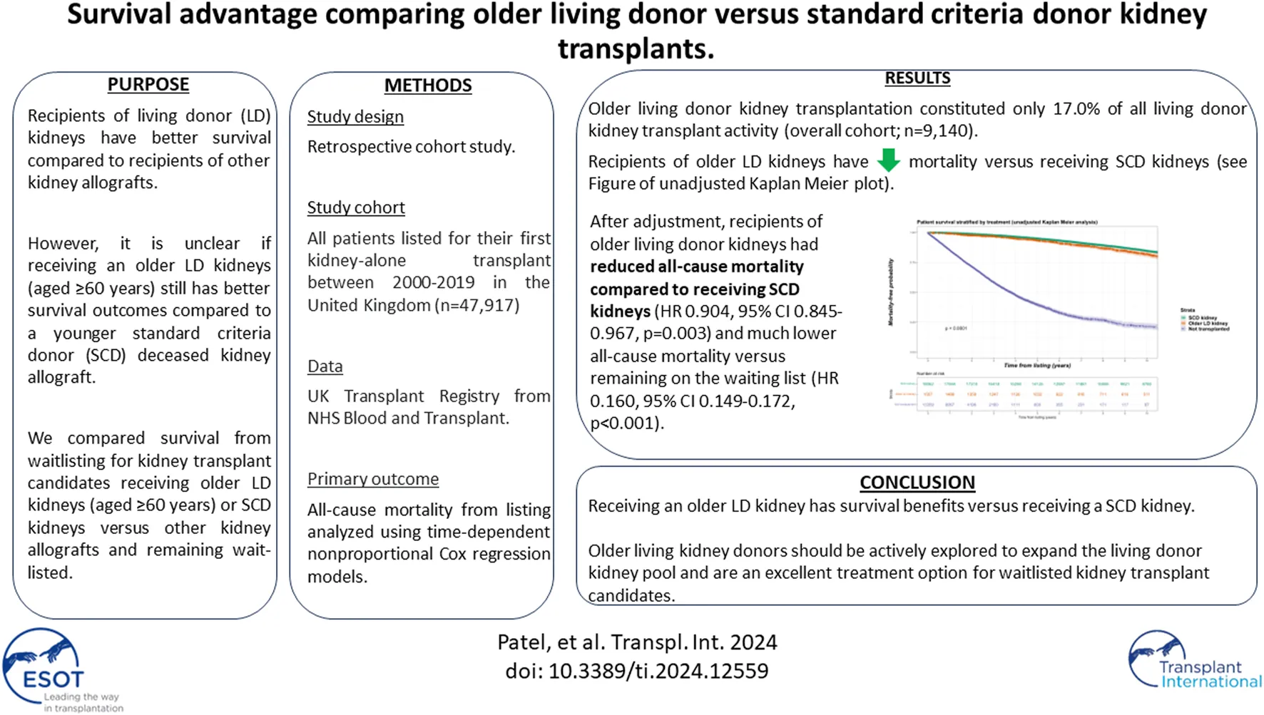 Patel K, Brotherton A, Chaudhry D, Evison F, Nieto T, Dabare D and Sharif A (2024) Survival Advantage Comparing Older Living Donor Versus Standard Criteria Donor Kidney Transplants. Transpl Int 37:12559. doi: 10.3389/ti.2024.12559
