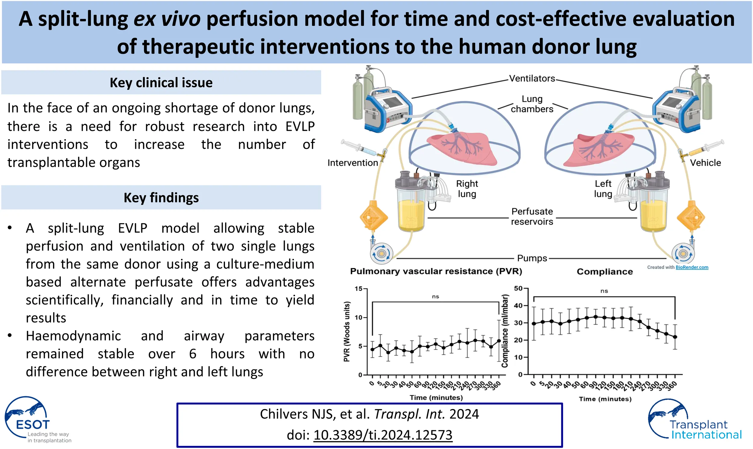 Chilvers NJS, Gilmour J, Brown ML, Bates L, Pang CY, Pauli H, Dark J and Fisher AJ (2024) A Split-Lung Ex Vivo Perfusion Model for Time- and Cost-Effective Evaluation of Therapeutic Interventions to the Human Donor Lung. Transpl Int 37:12573. doi: 10.3389/ti.2024.12573