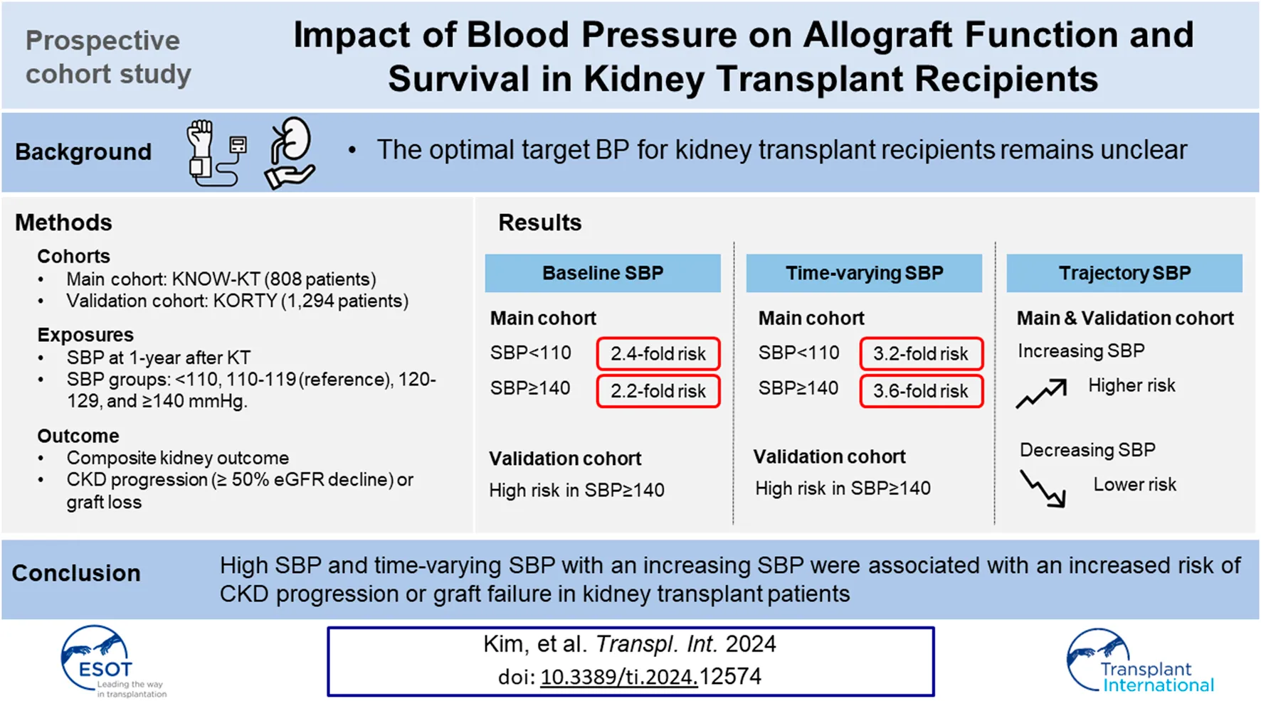 Kim HJ, Kim KW, Joo YS, Ryu J, Jung H-Y, Jeong KH, Kim M-G, Ju MK, Han S, Lee JS, Kang KP, Ro H, Lee KW, Huh KH, Kim MS, Kim BS and Yang J (2024) Impact of Blood Pressure on Allograft Function and Survival in Kidney Transplant Recipients. Transpl Int 37:12574. doi: 10.3389/ti.2024.12574