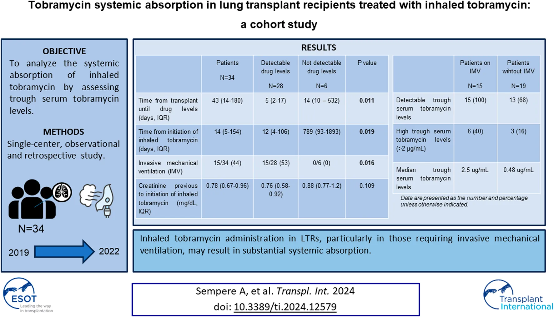 Sempere A, Los-Arcos I, Sacanell J, Berastegui C, Campany-Herrero D, Vima J, MartÃn-Gómez MT, Sánchez L, MartÃnez-González D, Bravo C, Len O and Gavaldà J (2024) Tobramycin Systemic Absorption in Lung Transplant Recipients Treated With Inhaled Tobramycin: A Cohort Study. Transpl Int 37:12579. doi: 10.3389/ti.2024.12579