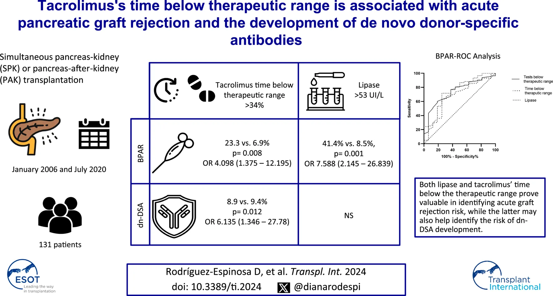 Rodríguez-Espinosa D, Broseta JJ, Montagud-Marrahí E, Arana C, Ferrer J, Cuatrecasas M, Garcia-Criado Á, Amor AJ, Diekmann F and Ventura-Aguiar P (2024) Tacrolimus’s Time Below Therapeutic Range Is Associated With Acute Pancreatic Graft Rejection and the Development of De Novo Donor-specific Antibodies. Transpl Int 37:12591. doi: 10.3389/ti.2024.12591