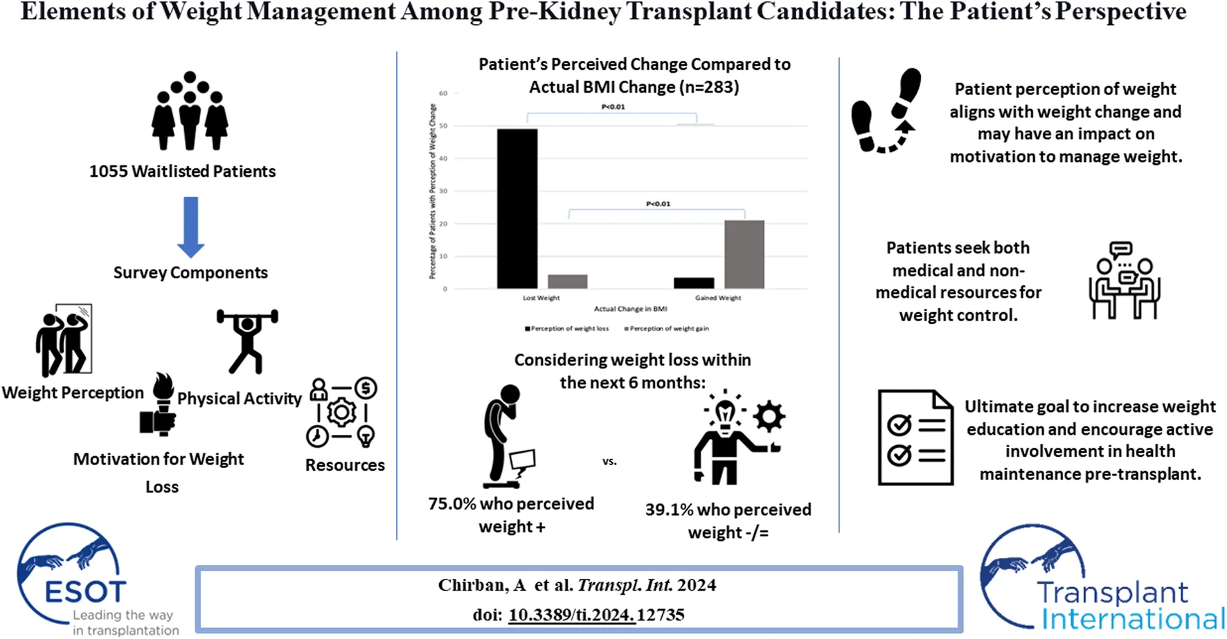 Chirban A, del Valle DD., Coe T, Cote MP., Chen M, Cataldo J, Elias N, Shah A and Dageforde LA (2024) Elements of Weight Management Among Pre-Kidney Transplant Candidates: The Patient Perspective. Transpl Int 37:12735. doi: 10.3389/ti.2024.12735