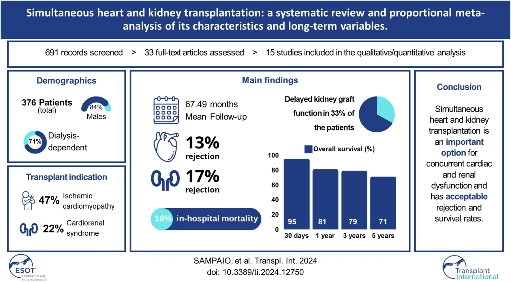 Sampaio NZ, Faleiro MD, Vieira LVdS, Lech GE, Viana SW, Tavares CPO, Mattiazzi AD and Burke GW (2024) Simultaneous Heart and Kidney Transplantation: A Systematic Review and Proportional Meta-Analysis of Its Characteristics and Long-Term Variables. Transpl Int 37:12750. doi: 10.3389/ti.2024.12750