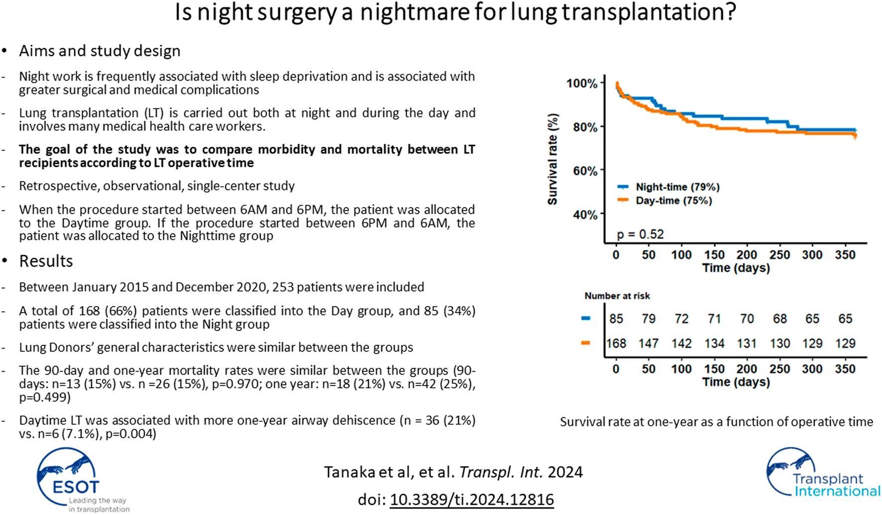 Tanaka S, De Tymowski C, Dupuis E, Tran-Dinh A, Lortat-Jacob B, Harpan A, Jean-Baptiste S, Boudinet S, Tahri C-Z, Salpin M, Castier Y, Mordant P, Mal H, Girault A, Atchade E, Montravers P and the Bichat Lung Transplant Group (2024) Is Night Surgery a Nightmare for Lung Transplantation?. Transpl Int 37:12816. doi: 10.3389/ti.2024.12816