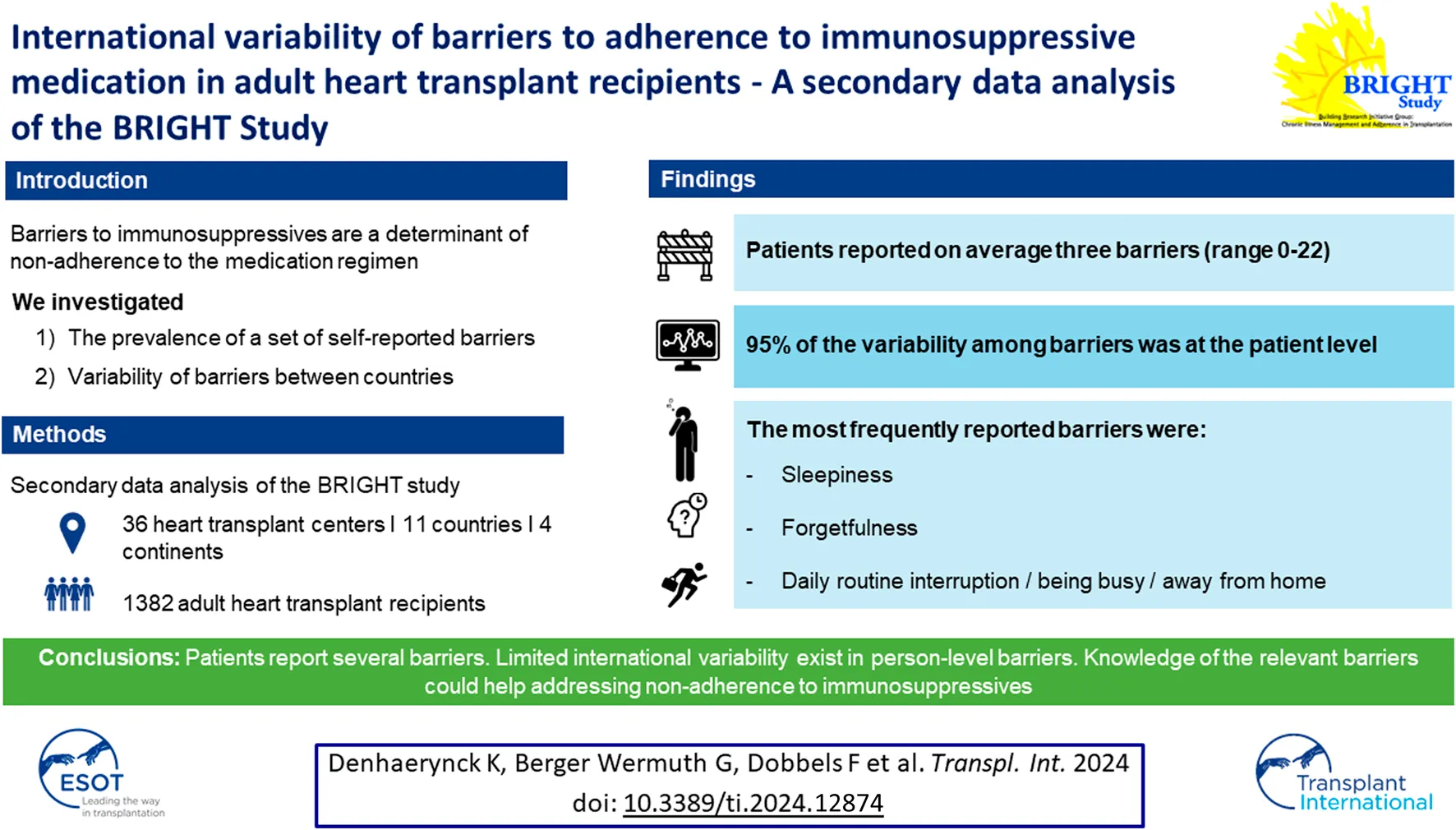 Denhaerynck K, Berger Wermuth G, Dobbels F, Berben L, Russell CL and De Geest S (2024) International Variability of Barriers to Adherence to Immunosuppressive Medication in Adult Heart Transplant Recipients. A Secondary Data Analysis of the BRIGHT Study. Transpl Int 37:12874. doi: 10.3389/ti.2024.12874