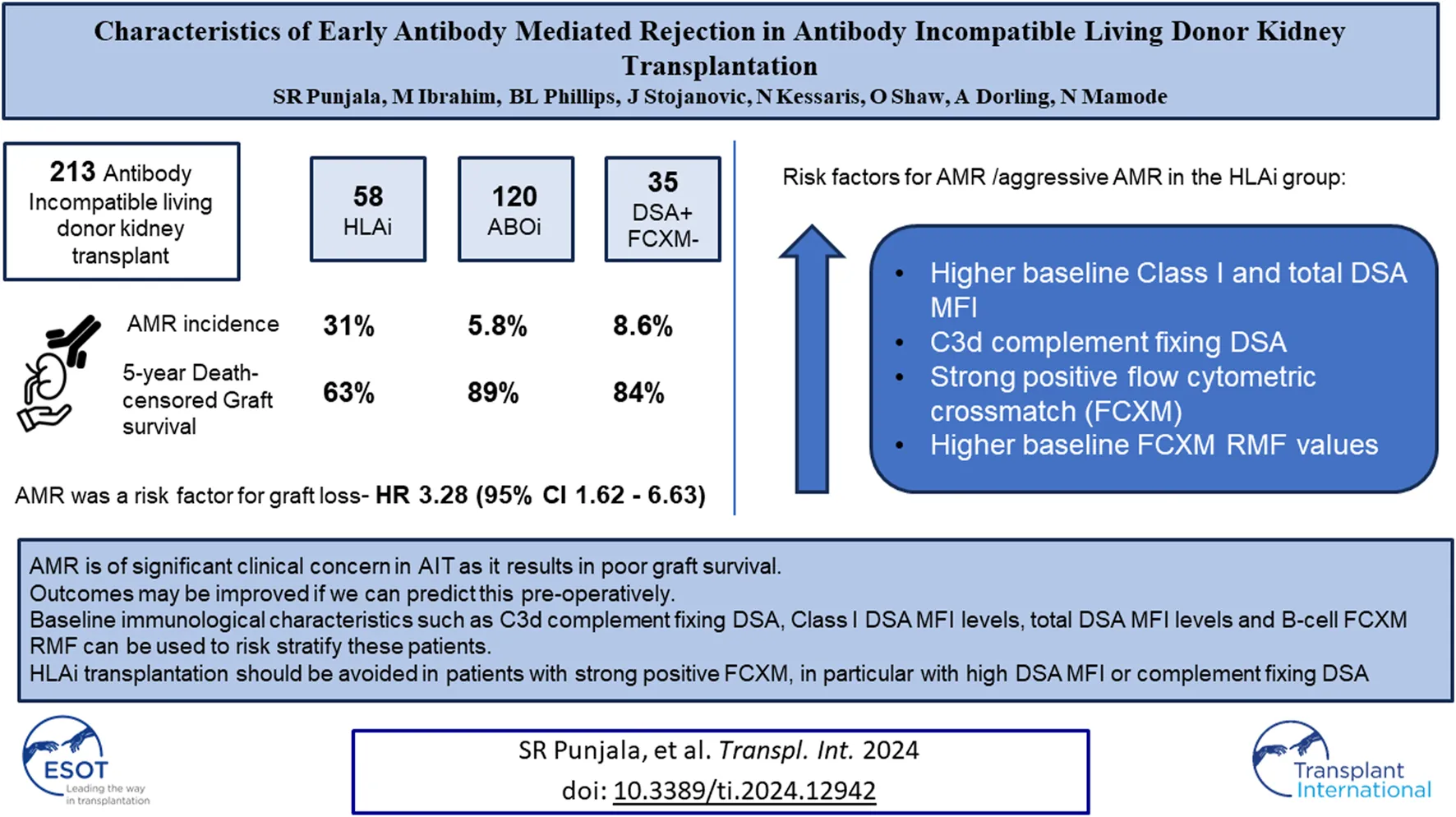 Punjala SR, Ibrahim M, Phillips BL, Stojanovic J, Kessaris N, Shaw O, Dorling A and Mamode N (2024) Characteristics of Early Antibody Mediated Rejection in Antibody Incompatible Living Donor Kidney Transplantation. Transpl Int 37:12942. doi: 10.3389/ti.2024.12942