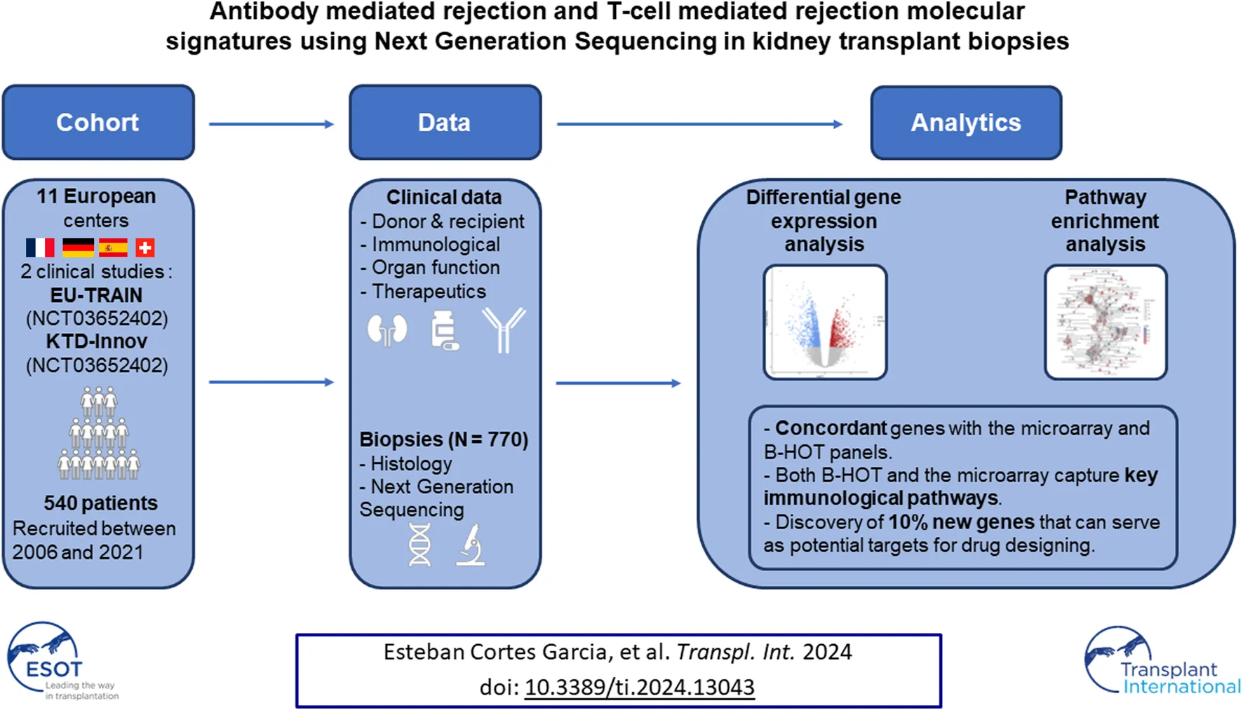 EU-TRAIN (NCT03652402) and KTD-Innov (NCT03582436) studies are large, prospective multicenter cohorts that follow adult kidney transplant recipients for 1 year after transplantation. They involve collaboration between transplant centers, analytical platforms, and industrial partners across France and Europe.