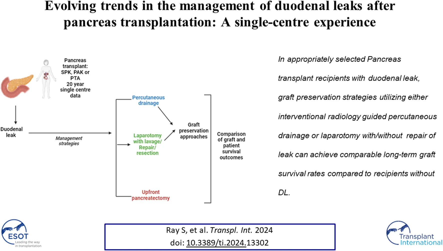 In conclusion, despite the seemingly devastating effects of duodenal leaks on graft survival, an early diagnosis and timely intervention can decrease the short- and long-term morbidity and mortality in these patients. Graft salvage strategies have shown promising long-term results in selected patients. Triaging patients into graft salvage versus upfront graft pancreatectomy approaches, based on a combination of peri-operative donor and recipient characteristics, clinical presentation of DL, radiological severity of peritoneal contamination, and the expertise of the IR team to target undrained collections, remains the cornerstone of management for achieving favorable outcomes in pancreas transplant recipients with duodenal leaks.