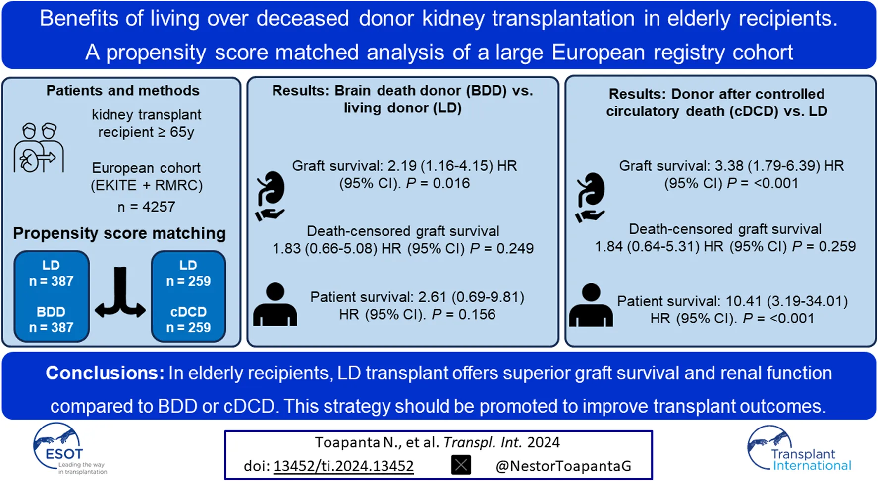 Toapanta N, Comas J, Revuelta I, Manonelles A, Facundo C, Pérez-Saez MJ, Vila A, Arcos E, Tort J, Giral M, Naesens M, Kuypers D, Asberg A, Moreso F, Bestard O and the EKITE consortium (2024) Benefits of Living Over Deceased Donor Kidney Transplantation in Elderly Recipients. A Propensity Score Matched Analysis of a Large European Registry Cohort. Transpl Int 37:13452. doi: 10.3389/ti.2024.13452