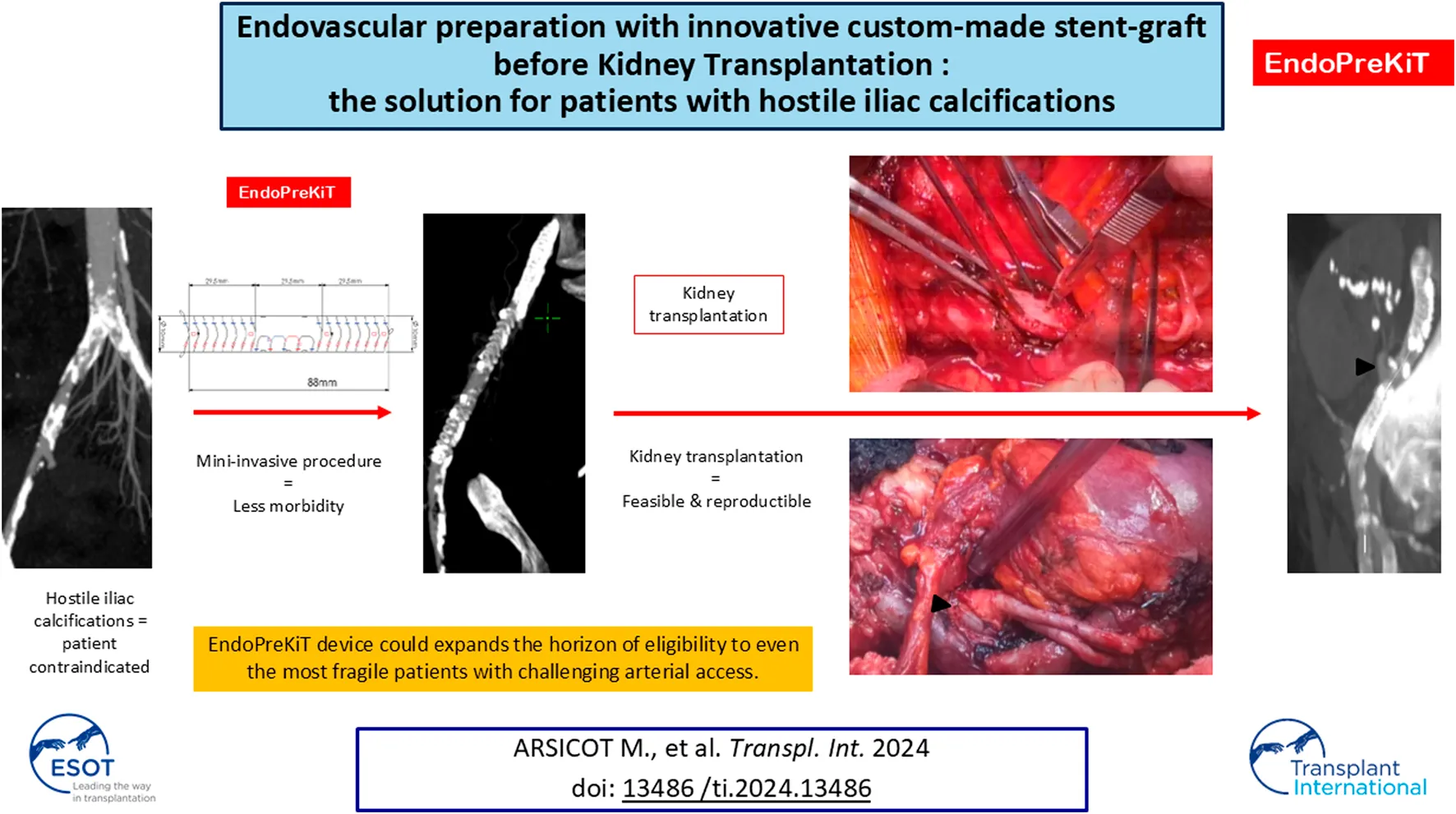 We designed the EndoPreKit from an original custom-made stent graft whose indication has been changed to make KT possible in this clinically complex population, characterised by a very high cardiovascular risk, through a solution which would appear to be simple, of low-morbidity, reproducible and effective. EndoPreKiT also makes it possible to perform KT under simple and reproducible surgical conditions. To our knowledge, this is the world’s first experience with a custom-made endoprosthesis in the field of transplantation, as it is already known for abdominal aortic aneurysm complex surgery.