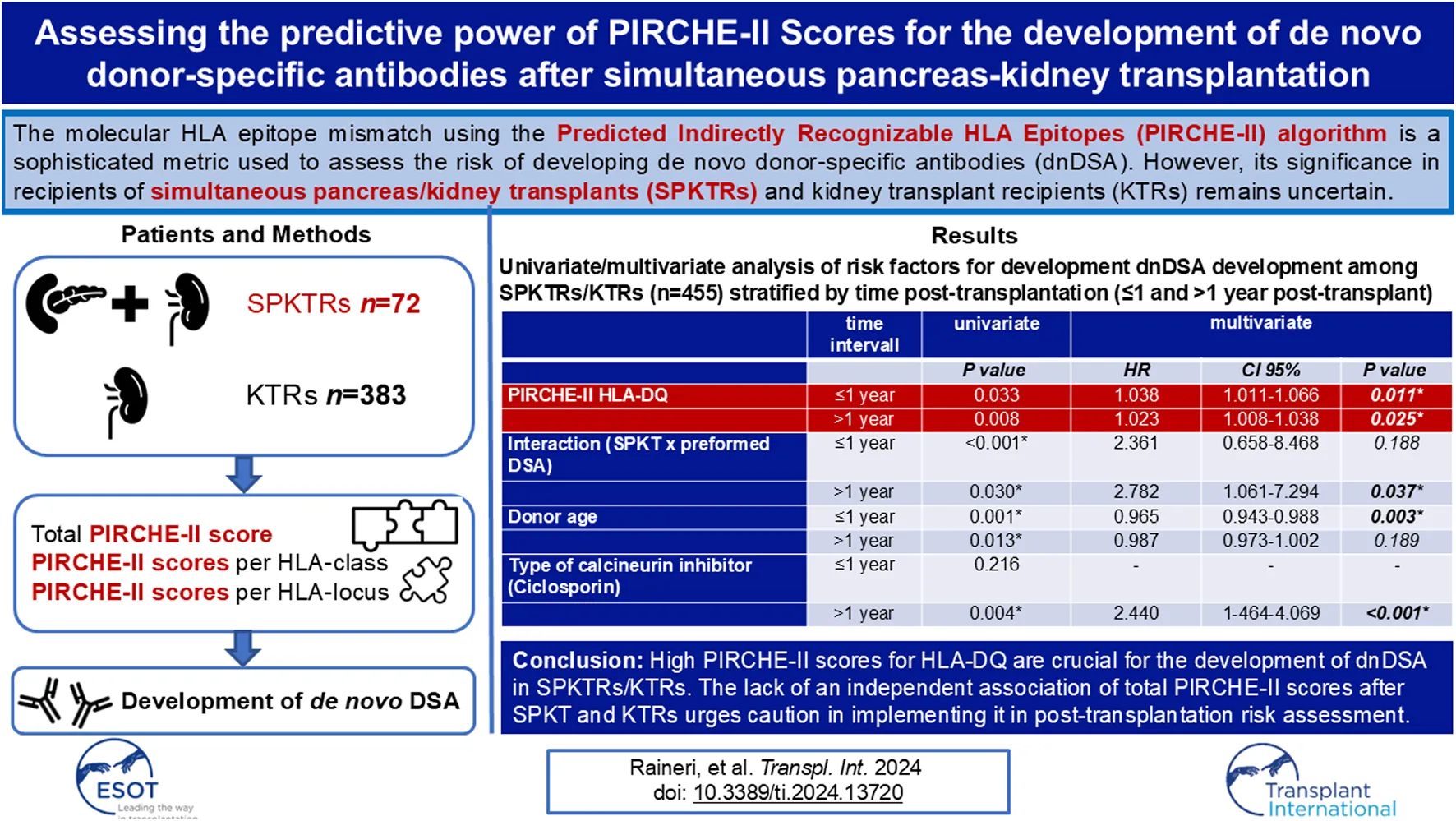 Our study aims to assess the impact of the Predicted Indirectly ReCognizable HLA Epitopes (PIRCHE-II) scores for the first time in predicting the development of dnDSA and graft outcomes in simultaneous pancreas/kidney transplantation recipients. The PIRCHE-II score is an established algorithm to calculate HLA epitope mismatches for certain HLA antigen mismatches. It estimates the number of indirectly recognizable, donor HLA-derived T cell epitopes and predicts T cell-related immune responses against the donor HLA-derived peptides. Moreover, the PIRCHE-II score has demonstrated the ability to predict the incidence of dnDSA in kidney transplantation (KT) independently and was associated with kidney allograft survival in a cohort of kidney transplantation [15, 16].