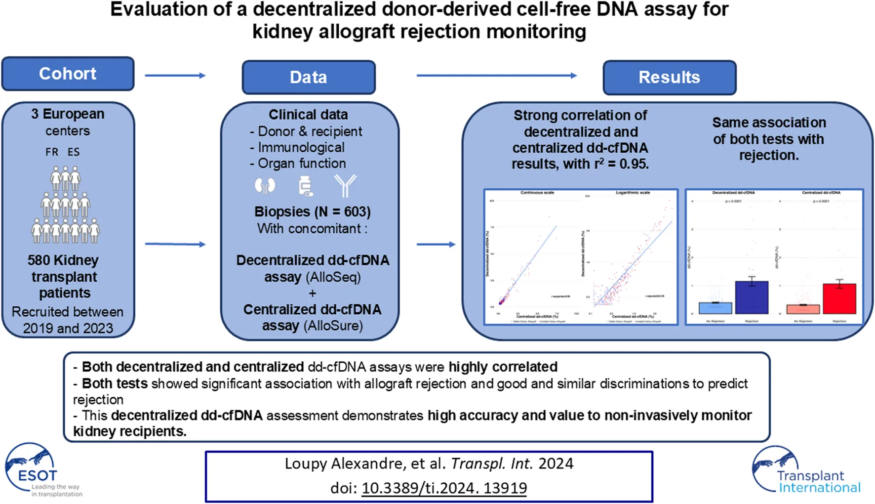 Loupy A, Certain A, Tangprasertchai NS, Racapé M, Ursule-Dufait C, Benbadi K, Raynaud M, Vaskova E, Marchis C, Casas S, Hague T, Bestard O, Kervella D, Lefaucheur C, Viard T and Aubert O (2024) Evaluation of a Decentralized Donor-Derived Cell-Free DNA Assay for Kidney Allograft Rejection Monitoring. Transpl Int 37:13919. doi: 10.3389/ti.2024.13919