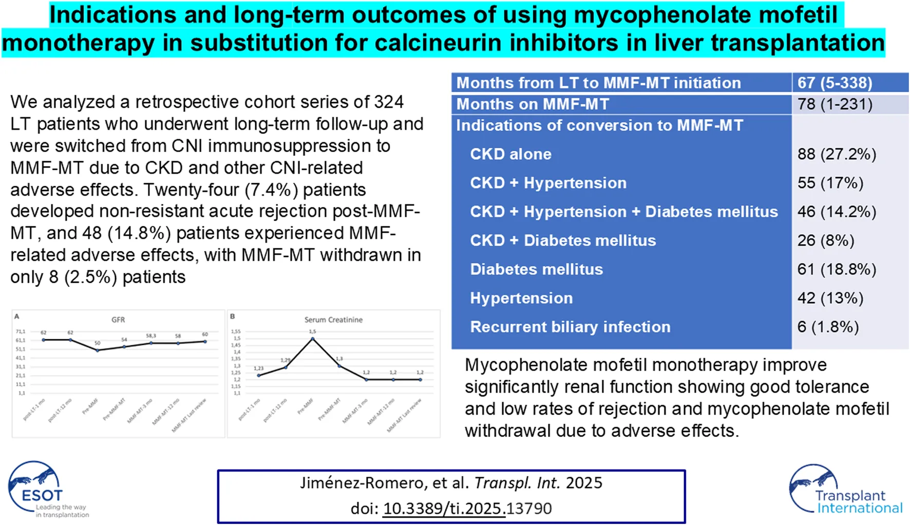 Jiménez-Romero C, Justo Alonso I, Caso Maestro O, Manrique Municio A, García-Sesma Á, Calvo Pulido J, Cambra Molero F, Loinaz Segurola C, Martín-Arriscado C, Nutu A and Marcacuzco Quinto A (2025) Indications and Long-Term Outcomes of Using Mycophenolate Mofetil Monotherapy in Substitution for Calcineurin Inhibitors in Liver Transplantation. Transpl Int 38:13790. doi: 10.3389/ti.2025.13790