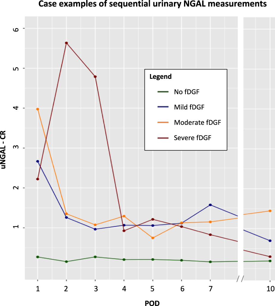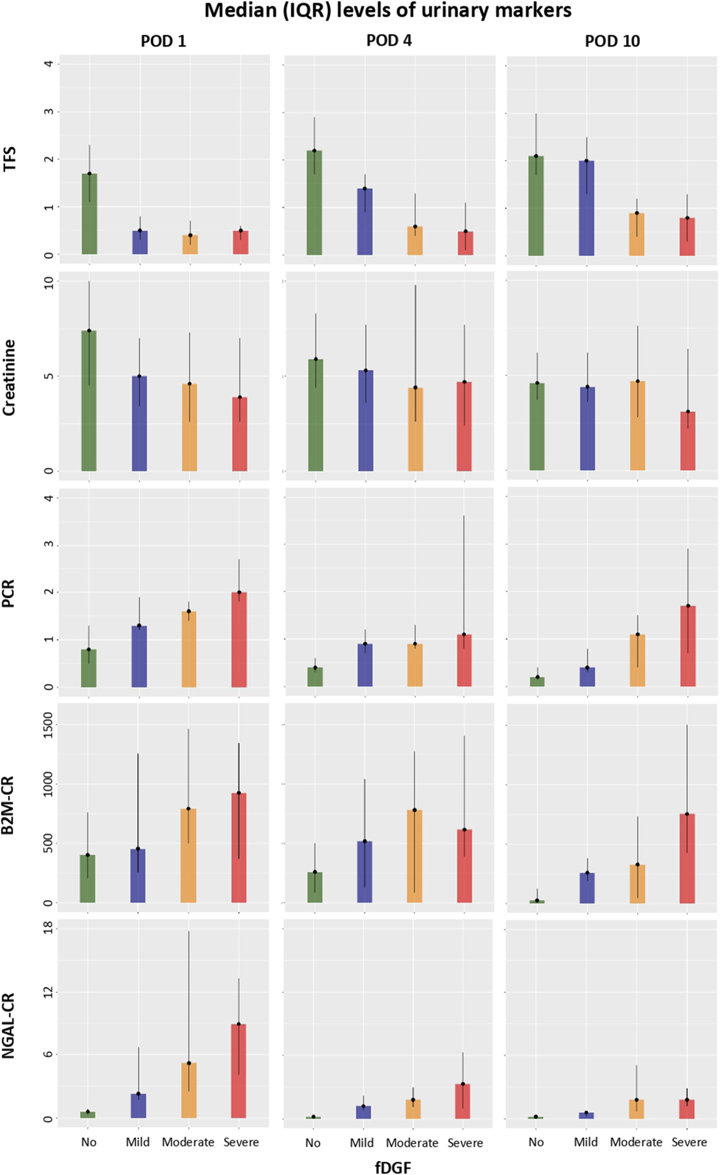 Fourth, we calculated the median (interquartile range [IQR]) values of TFS, urine volume, creatinine, PCR, and creatinine-corrected NGAL, B2M, TIMP2, IGFBP7, KIM-1, CXCL9, UMOD, and FE-NGAL and FE-B2M on PODs 1, 4 and 10, for all recipients and stratified by fDGF duration.