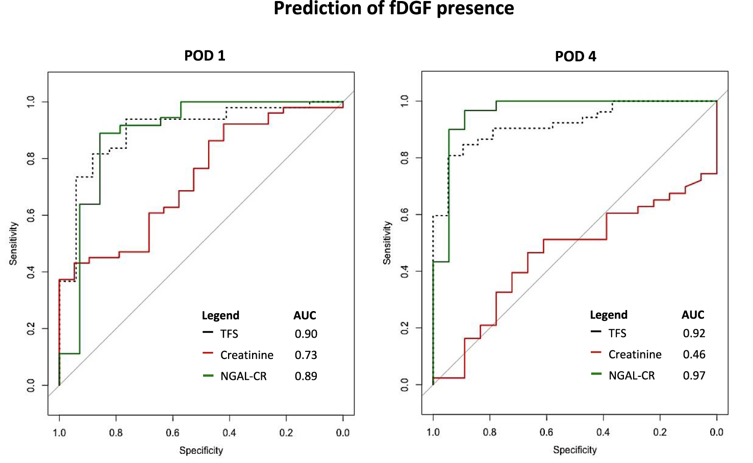 Sixth, we calculated AUCs with receiver operating characteristic (ROC) analyses for fDGF presence at PODs 1 and 4, and fDGF severity at POD 10 as predicted by standardized TFS, urinary creatinine, PCR and standardized creatinine-corrected urinary NGAL, B2M, TIMP2, IGFBP7, KIM-1, CXCL9, UMOD, FE-NGAL and FE-B2M. In all regression and ROC analyses, markers were divided by their SD to normalize their distributions.