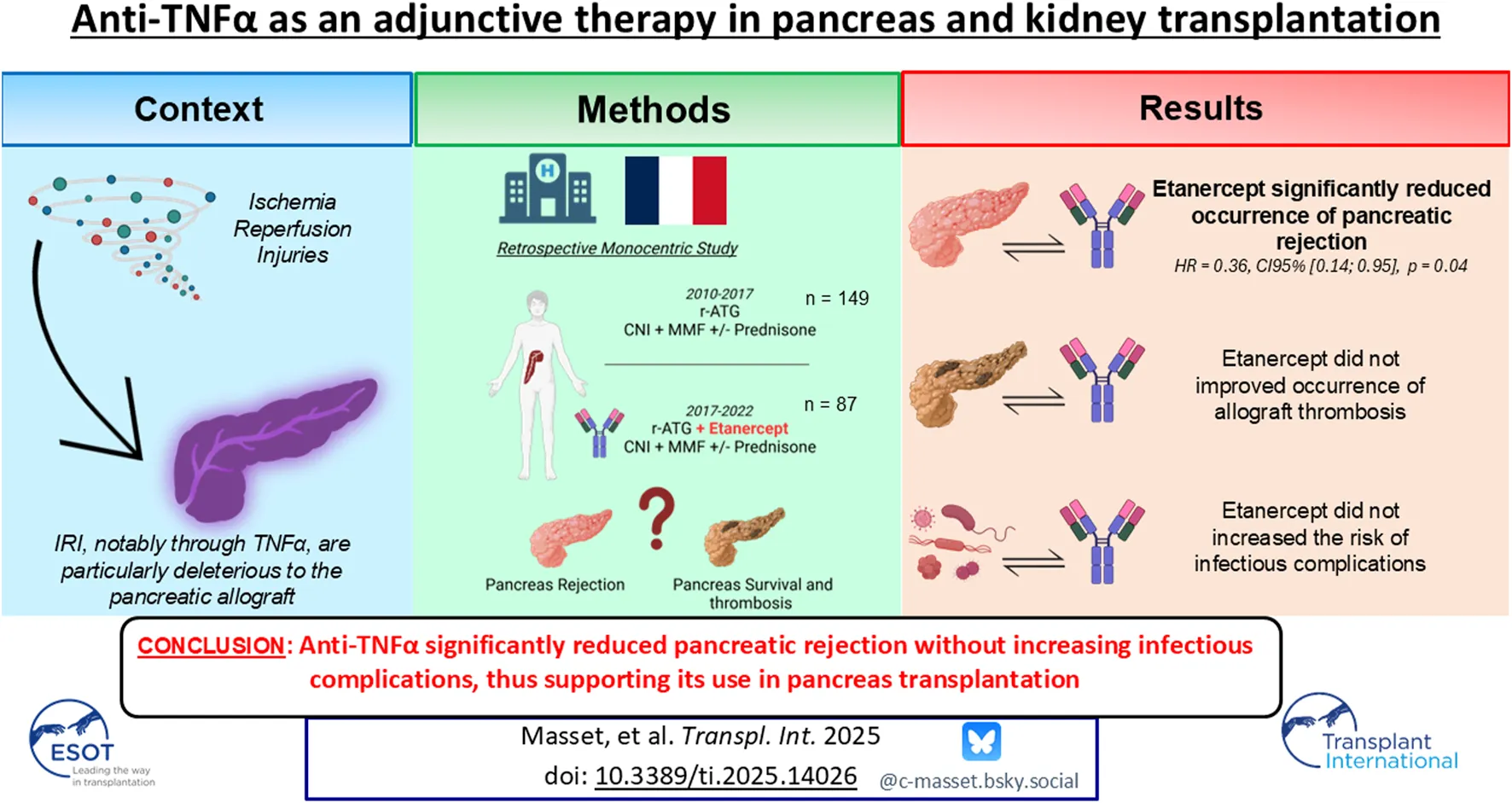 Drawing from the experience of islet transplant recipients, we opted several years ago to modify the immunosuppressive strategy in pancreas transplant recipients by incorporating Etanercept during the early post-operative period. Indeed, blocking TNFα in the early post-transplantation period appears to be a very promising strategy, as it helps reduce the cytokine storm associated with ischemia-reperfusion injury and the subsequent risk of allograft rejection. This approach is particularly relevant in the context of pancreatic transplantation, given the highly inflammatory nature of the digestive segment transplanted alongside the pancreas to ensure exocrine drainage. We thus hypothesized that an anti-TNFα therapy may be beneficial by reducing activation of immune system following ischemia/reperfusion, and thus reduce occurrence of pancreas rejection and immunological thrombosis.