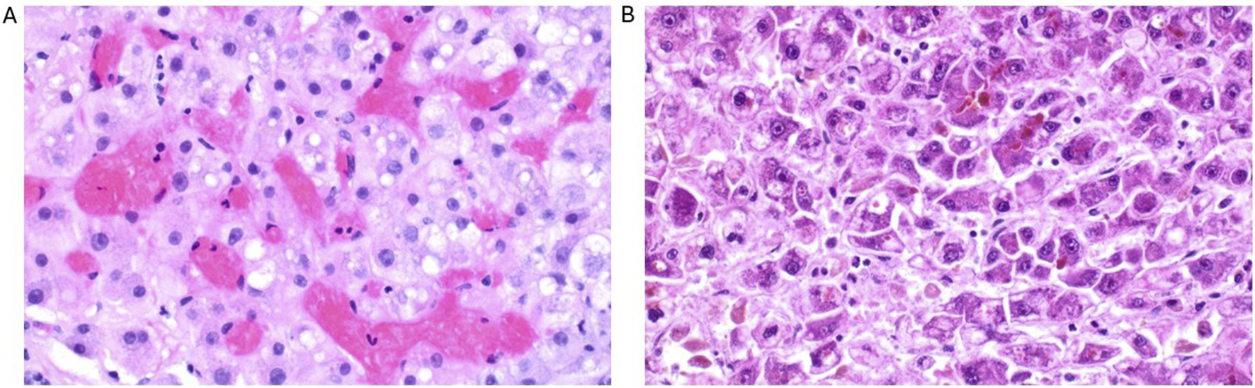 Histological findings of the liver biopsy (1 day after admission) with sinusoidal obstruction and congestion due to sickle cell aggregates with hepatocyte swelling and numerous single cell deaths (A) as well as the liver explant (3 days after admission) with significantly more pronounced necrosis compared to the prior biopsy (B).