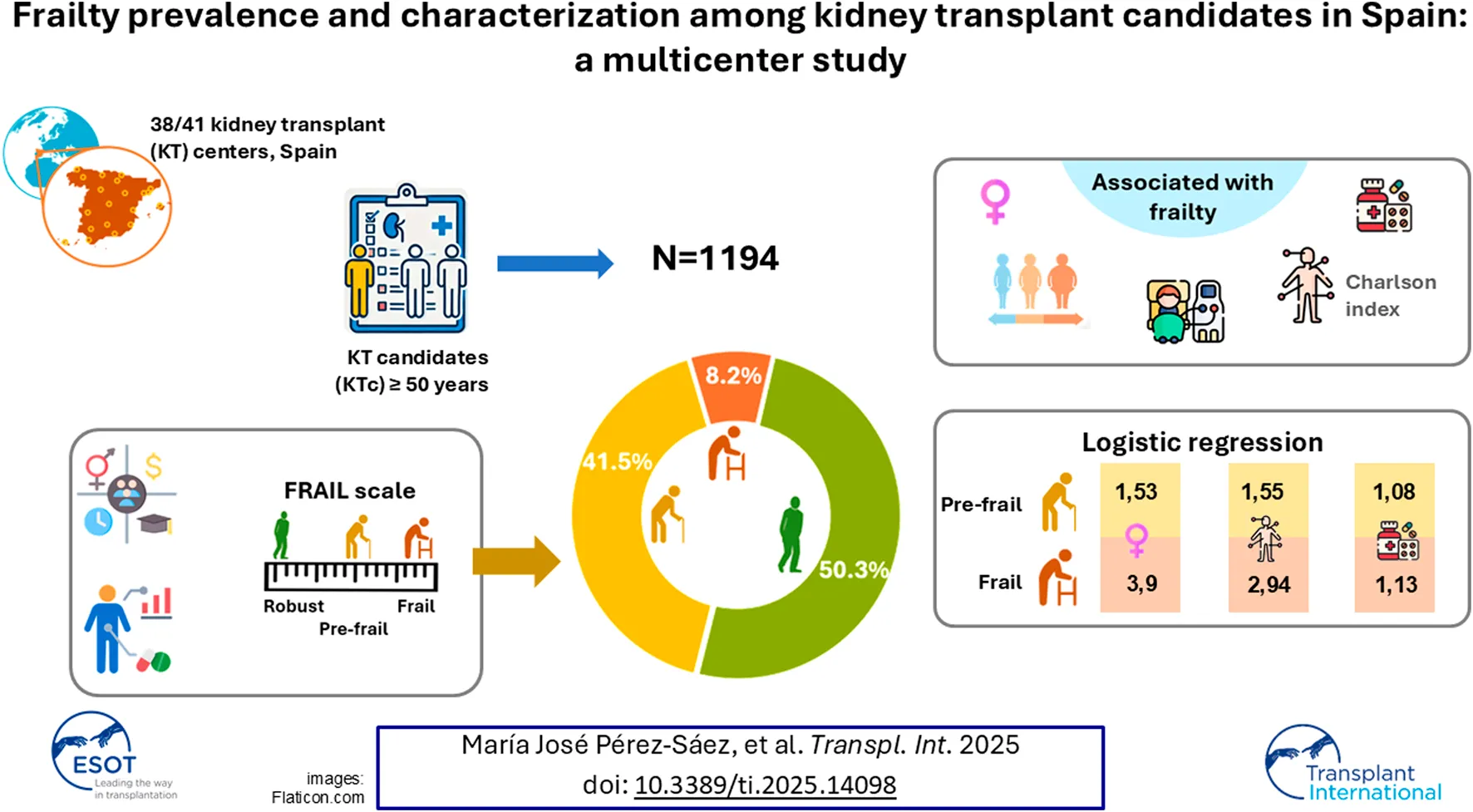 Pérez-Sáez MJ, Melilli E, Arias M, Franco A, Martínez R, Sancho A, Molina M, Facundo C, Polanco N, López V, Mazuecos A, Cabello S, González García ME, Suárez ML, Auyanet I, Espi J, García Falcón T, Ruiz JC, Galeano C, Artamendi M, Rodríguez-Ferrero ML, Portolés JM, Santana MA, Martín-Moreno PL, Arhda N, Calvo M, Mendiluce A, Macía M, Pérez-Tamajón ML, de Teresa J, Gascó B, Soriano S, Tabernero G, de la Vara L, Ramos AM, Martínez R, Montero de Espinosa E, Zalve JL, Pascual J, Rodríguez-Mañas L, Gutiérrez-Dalmau A and Moreso F (2025) Frailty Prevalence and Characterization Among Kidney Transplant Candidates in Spain: A Multicenter Study. Transpl. Int. 38:14098. doi: 10.3389/ti.2025.14098