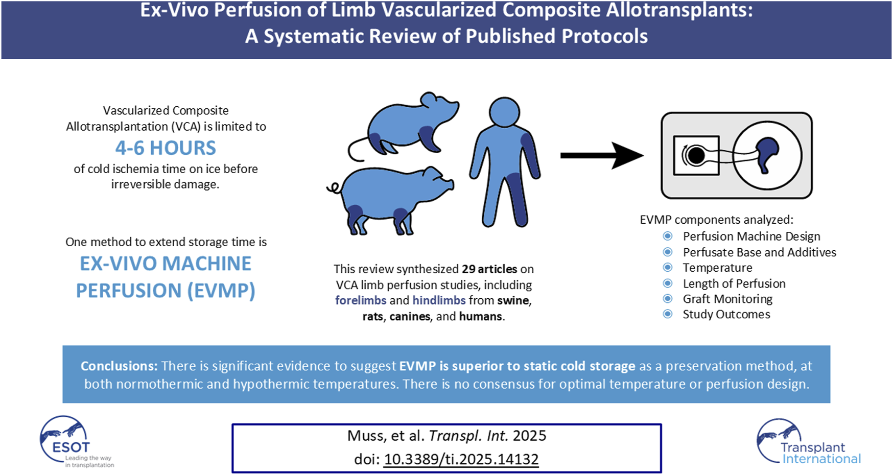 Muss TE, Drivas EM, Loftin AH, Guo Y, Zhang Y, Lopez CD, Girard AO, Lake IV, Hassan B, Kalsi R, Oh BC and Brandacher G (2025) Ex-Vivo Perfusion of Limb Vascularized Composite Allotransplants: A Systematic Review of Published Protocols. Transpl. Int. 38:14132. doi: 10.3389/ti.2025.14132