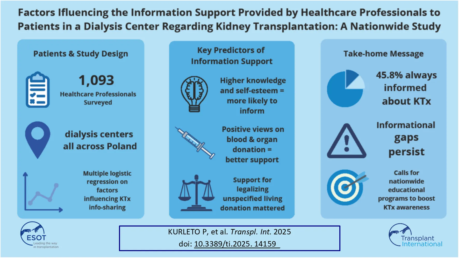 Kurleto P, Tomaszek L, Milaniak I, Dębska G, Turkanik E, Siekierska B, Danielewicz R and Dębska-Ślizień A (2025) Factors Influencing the Information Support Provided by Health Care Professionals to Patients in a Dialysis Center Regarding Kidney Transplantation: A Nationwide Study. Transpl. Int. 38:14159. doi: 10.3389/ti.2025.14159