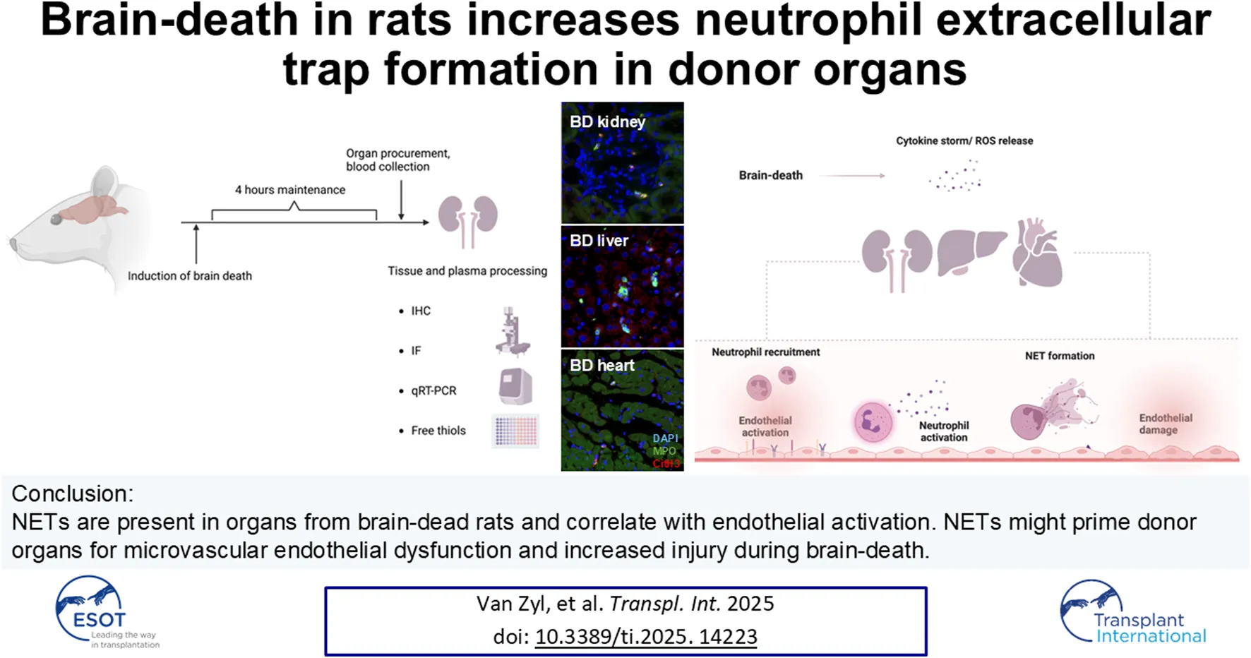 Van Zyl M, Armstrong Junior R, Ottens P, Van Goor H, Van Rooy M-J, Lisman T, Leuvenink HG.D. and Hillebrands J-L (2025) Brain-Death in Rats Increases Neutrophil Extracellular Trap Formation in Donor Organs. Transpl. Int. 38:14223. doi: 10.3389/ti.2025.14223
