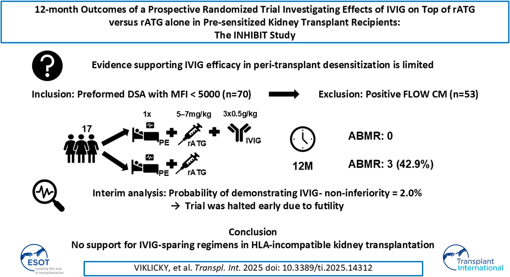 Viklicky O, Zahradka I, Mares J, Slatinska J, Parikova A, Petr V, Roder M, Jaklova K, Osickova K, Janousek L and Hruba P (2025) 12-Month Outcomes of a Prospective Randomized Trial Investigating Effects of IVIG on Top of rATG Versus rATG Alone in Pre-Sensitized Kidney Transplant Recipients: The INHIBIT Study. Transpl. Int. 38:14312. doi: 10.3389/ti.2025.14312