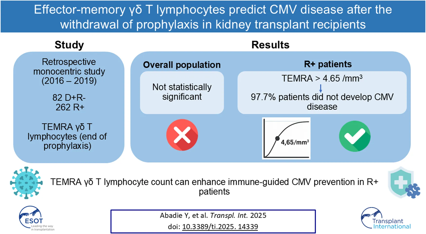 Abadie Y, Visentin J, Wojciechowski E, Charrier M, Déchanet-Merville J, Garrigue I, Blanco P, Merville P, Kaminski H and Couzi L (2025) Effector-Memory γδ T Lymphocytes Predict CMV Disease After the Withdrawal of Prophylaxis in Kidney Transplant Recipients. Transpl. Int. 38:14339. doi: 10.3389/ti.2025.14339
