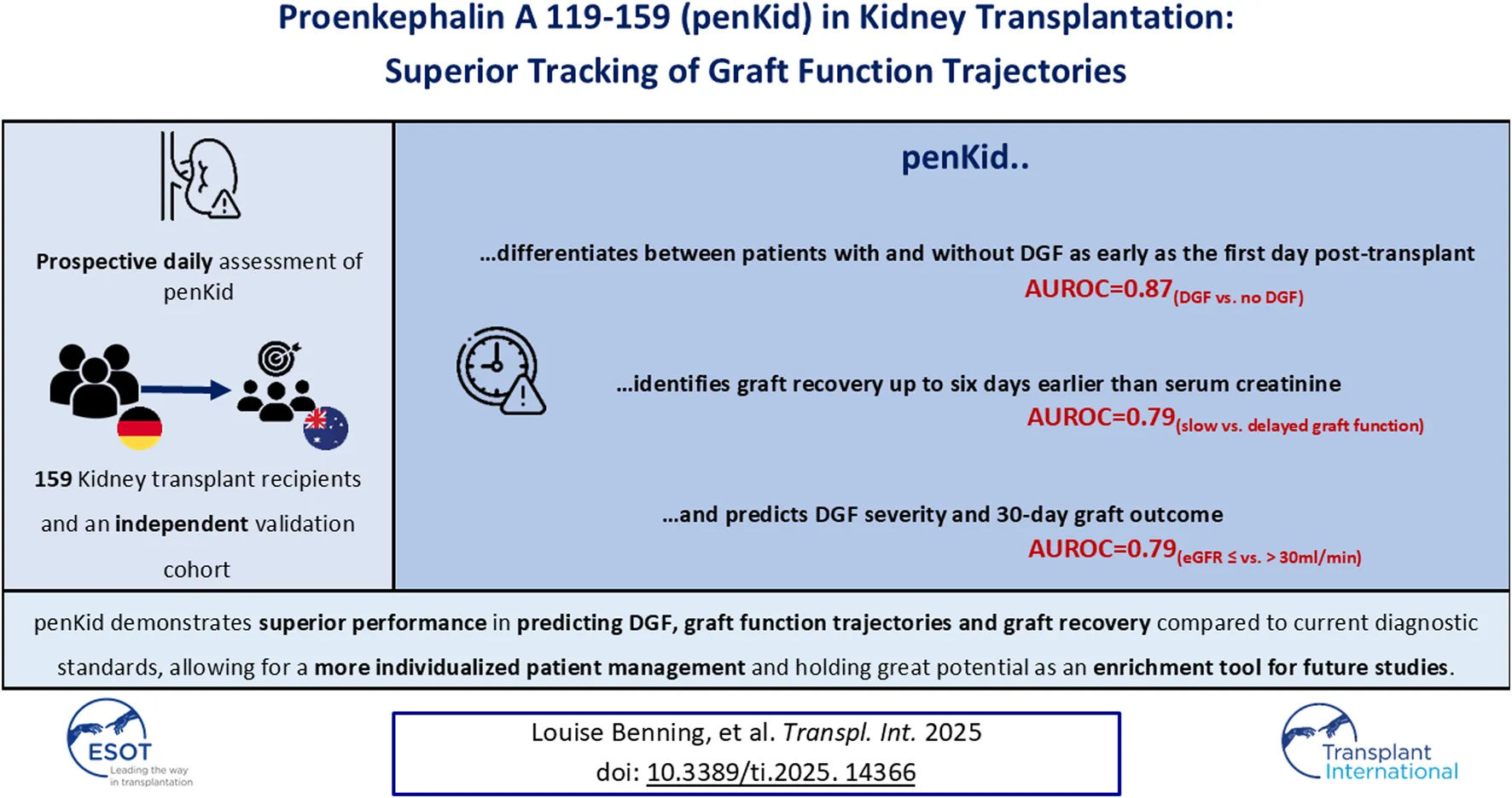 Despite these encouraging findings, several limitations need to be addressed. First, although validation was performed using an independent transplant cohort, larger multicenter studies across diverse healthcare systems and organ donation settings are necessary to confirm these results and ensure broader generalizability. Second, as the study design was observational, it remains speculative whether real-time clinical decision-making based on penKid levels could directly improve patient management and outcomes. Nevertheless, penKid-guided risk stratification and diagnostic enrichment could play a pivotal role in optimizing future clinical trial designs, individualized patient management and therapeutic interventions. Lastly, this study did not include a direct comparison of penKid with other established or emerging kidney biomarkers, such as Cystatin C, NGAL, KIM-1 and others. The real-world clinical setting of our study limited the feasibility of incorporating these additional biomarkers. Future research should prioritize head-to-head comparisons between penKid and other kidney biomarkers to clarify their relative accuracy and clinical utility in assessing graft function trajectories and transplant outcomes.