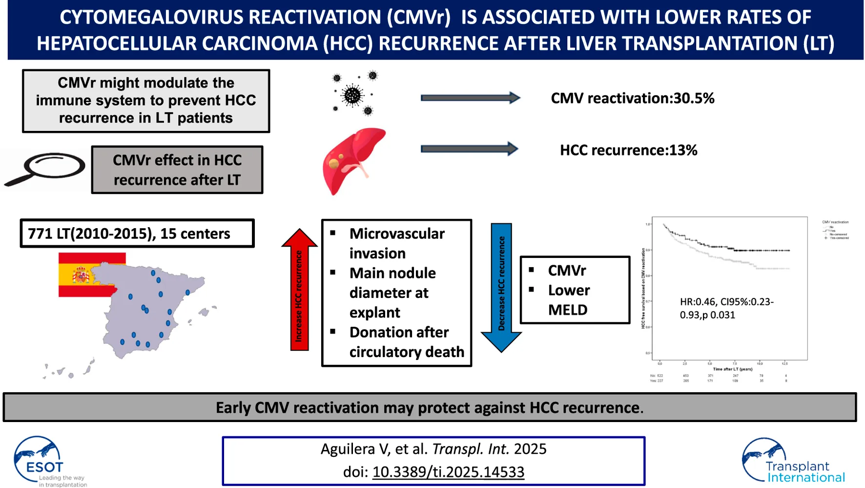 Established factors favoring HCC recurrence include microvascular invasion and high alpha-fetoprotein (AFP) levels, along with tumor numbers and size. Although cytomegalovirus (CMV) infection is the most common opportunistic infection in LT recipients and remains a cause of life-threatening disease and allograft rejection [12, 13], recent studies have suggested a potential beneficial effect of CMV reactivation (CMVr) in some tumors [14, 15]. Immune modulation and modification of the tumor microenvironment following CMVr could be responsible for tumor control in this scenario [16–20].