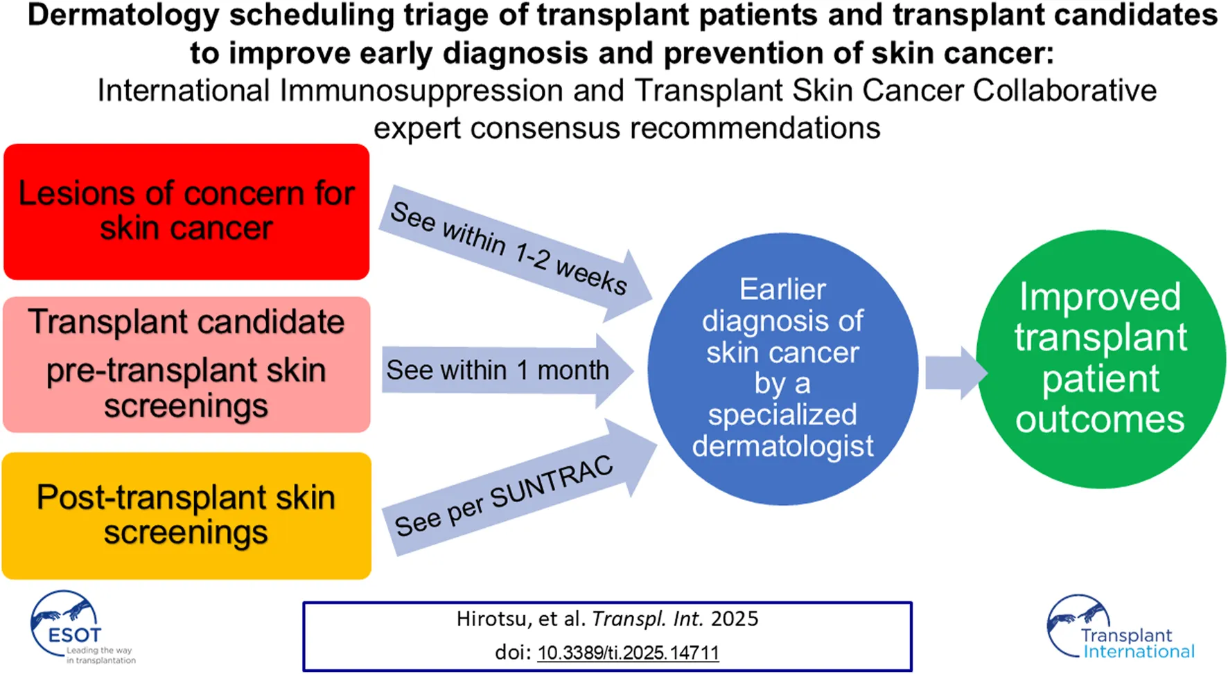 Hirotsu KE., Crowe L, Michalski-McNeely B, Arron ST., Bibee K, Bottomley MJ., Carr DR., Carter JB., Christensen SR., Chung C, Jambusaria A, Ken KM., Loss MJ., Paragh G, Plasmeijer EI., Proby C, Pugliano-Mauro M, Shahwan KT., Whitley MJ and Carroll BT. (2025) Dermatology Scheduling Triage of Transplant Patients and Transplant Candidates to Improve Early Diagnosis and Prevention of Skin Cancer: International Immunosuppression and Transplant Skin Cancer Collaborative Expert Consensus Recommendations. Transpl. Int. 38:14711. doi: 10.3389/ti.2025.14711