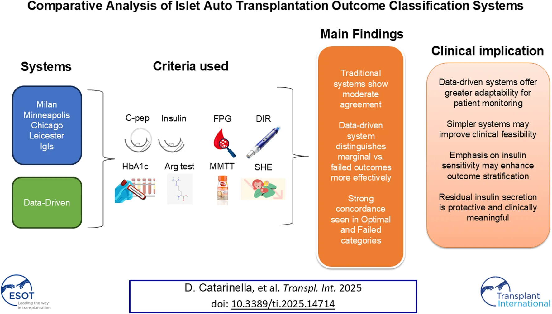 Catarinella D, Magistretti P, Melzi R, Mercalli A, Tentori S, Gremizzi C, Paloschi V, Sala S, Valla L, Aleotti F, Costa S, De Cobelli F, Caldara R and Piemonti L (2025) Comparative Analysis of Islet Auto-Transplantation Outcome Classification Systems: Evaluating Concordance, Feasibility, and a Data-Driven Approach. Transpl. Int. 38:14714. doi: 10.3389/ti.2025.14714